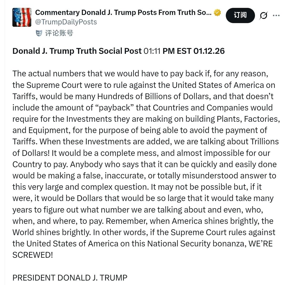 特朗普:如果最高法院出于任何原因在关税问题上对美利坚合众国作出不利裁决,我们实际需要退还的金额将达到数千亿美元,而这还不包括各国和公司为了避免支付关税而在建造工厂、设备等方面所进行的投资所要求的“回报”。把这些投资加进去,我们谈论的可是数万亿美元!这将是一场彻底的混乱,我们国家几乎不可能支付得起。任何说这可以快速、轻易完成的人,都是在给出虚假、不准确或完全误解的回答,这是一个非常庞大且复杂的问题。可能根本做不到,但就算能做到,那也是一笔大到需要很多年才能搞清楚具体数额、该付给谁、何时付、在哪里付的巨款。请记住,当美国闪耀光芒时,全世界都会跟着闪耀。换句话说,如果最高法院在这个国家安全大礼包上对美利坚合众国作出不利裁决,我们就完蛋了(WE’RE SCREWED)!唐纳德·J·特朗普总统