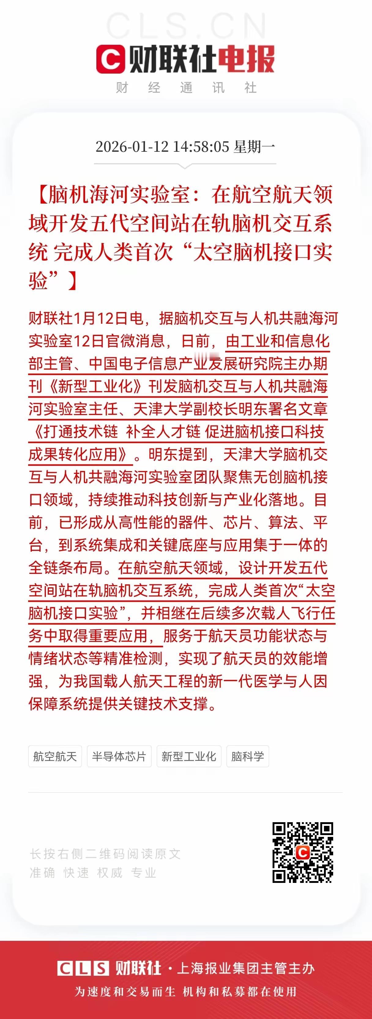 重大利好! 脑机,商业航天继续高歌猛进! 在航空航天领域,设计开发五代空间站在轨脑机交互系统,完成人类首次“太空脑机接口实验”,并相继在后续多次载人飞行任务中取得重要应用,服务于航天员功能状态与情绪状态等精准检测,实现了航天员的效能增强,为我国载人航天工程的新一代医学与人因保障系统提供关键技术支撑。
