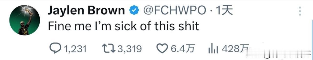 一辈子没见过这种要求!!!杰伦-布朗公开批评裁判,主动请求罚款35000美元! 北京时间1月13日,NBA官方宣布消息,凯尔特人前锋杰伦-布朗因公开批评和质疑裁判的吹罚,被罚款35000美元! 而且这是杰伦-布朗自己主动要求被罚的,从来没见过这样的要求,那必须要满足你了。 在1月10号主场对阵马刺的比赛中,凯尔特人95-100不敌马刺,赛后,作为球队目前的领袖,布朗当着媒体的面公然挑衅裁判,认为裁判吹罚尺度有问题,并直接发布到了社媒,表示你们罚我钱吧,我对你们已经受够了! 布朗是想用自己的罚款让联盟意识到现在裁判组存在的问题,但是这样的问题已经持续了很久,要想彻底解决也是很难的。 当然,作为球员还是要为自己争取,35000美元对布朗来说不多,为了是出一口气! 凯尔特人 布朗