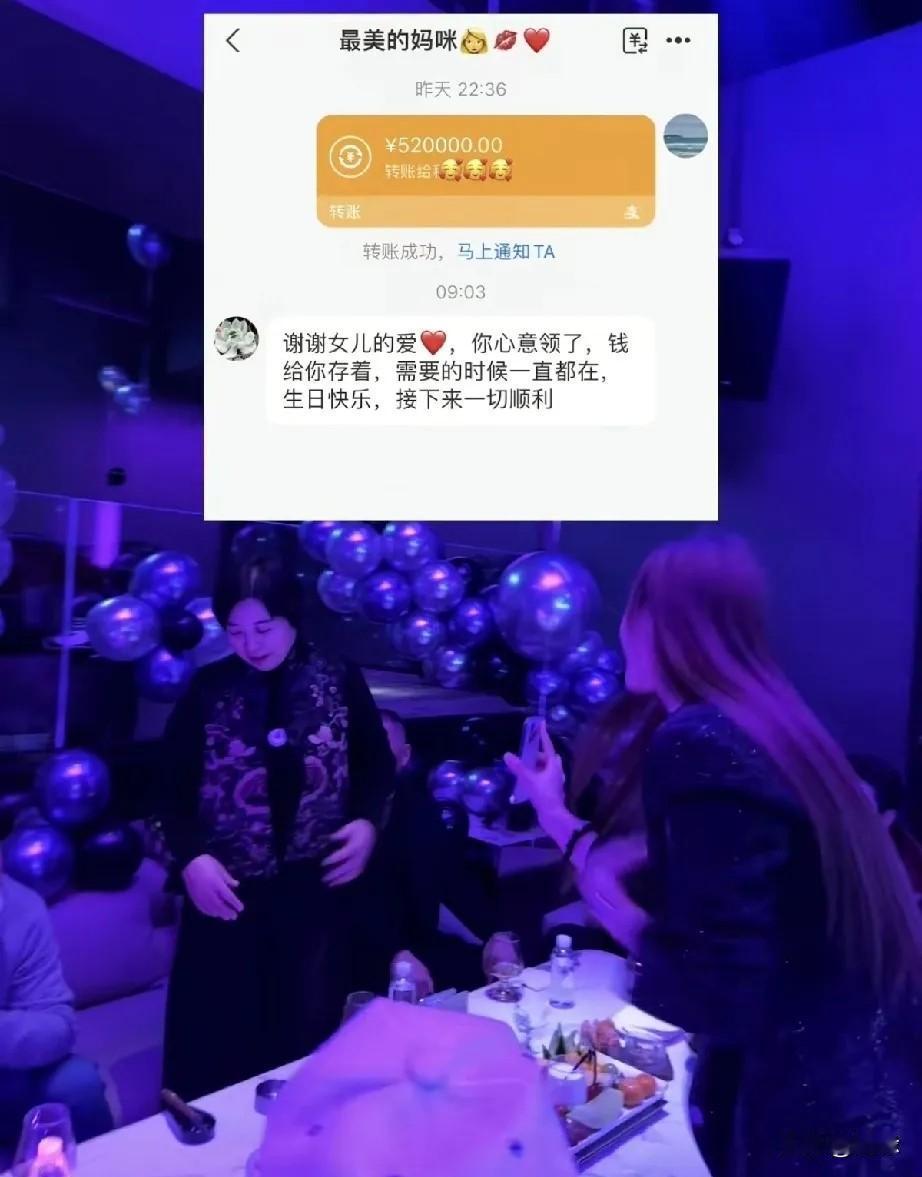 张颖颖过30岁生日,直接给自己妈妈发了一个52万的大红包,代表很爱妈妈,也是感谢妈妈一路以来的付出与陪伴。 不管有多少人不喜欢张颖颖,也不管她跟张兰母子撕的有多难看,但不得不承认,她确实是一个极其孝顺的女儿。 她为家人购置房子,承担妹妹的读书费用,带家人到处旅游,有家人的陪伴,她也很有底气。 讲真,抛开跟汪小菲的那段过往,她日子过得还是有滋有味的。