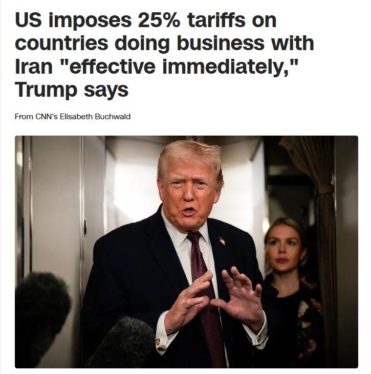 美国总统唐纳德·特朗普1月12日宣布对与伊朗有业务往来的国家征收关税。特朗普在Truth Social上写道:“即刻生效,任何与伊朗伊斯兰共和国做生意的国家,与美国进行的所有业务都将支付25%的关税。本命令为最终且决定性。”