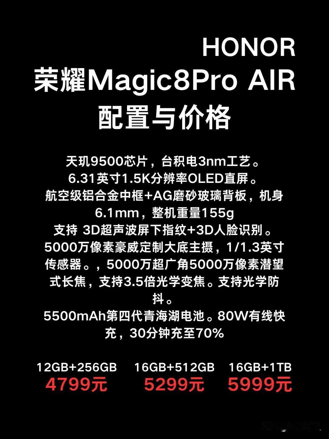 荣耀Magic8 Pro Air价格与配置曝光,这价格也有点太假了吧?小伙伴们,你们觉得呢?