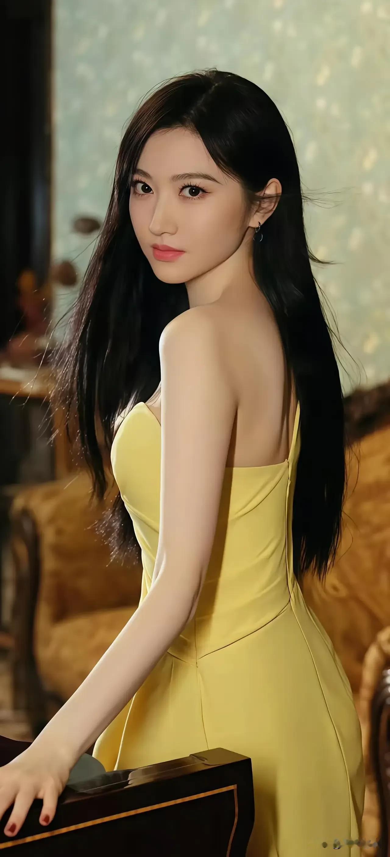明黄缎面吊带裙衬着暖调复古室内,顺直长发搭配揉出明艳又优雅的晚宴氛围感💛 气质吊带黑裙 吊带气质黑裙