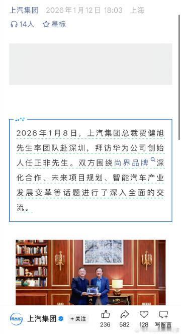 上汽总裁亲自带队,去深圳拜访华为任正非估计尚界今年会有不少大动作【来自懂车帝车友圈】