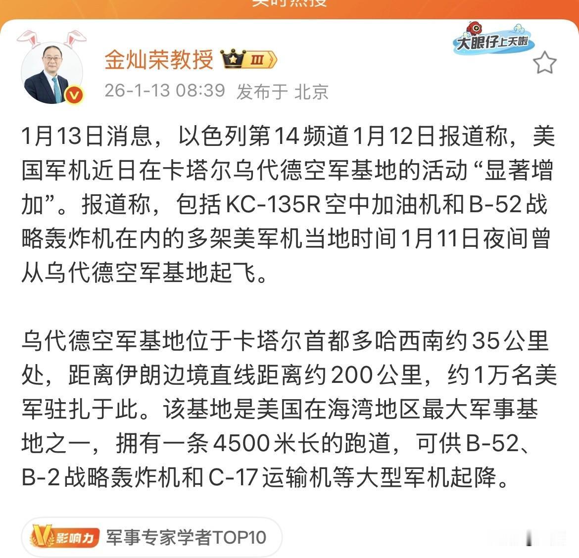 金灿荣:美国军机近日在卡塔尔乌代德空军基地的活动“显著增加”!不允许其他国家与伊