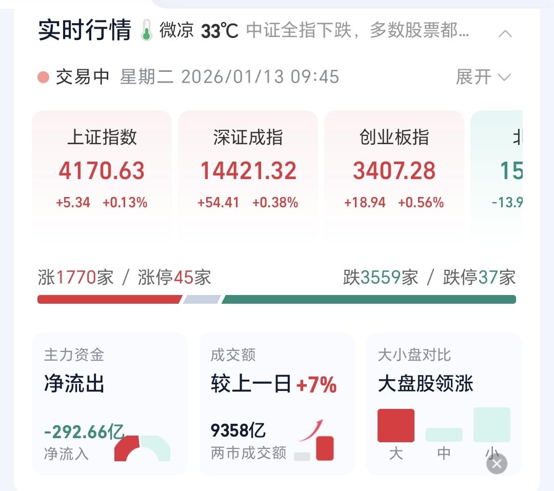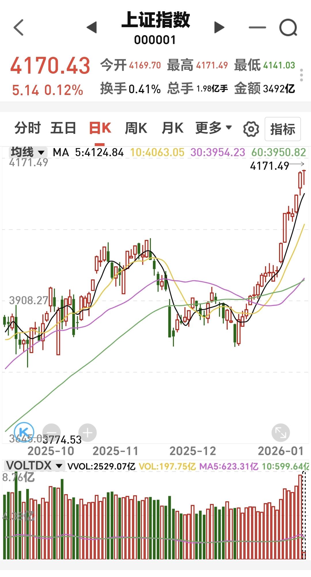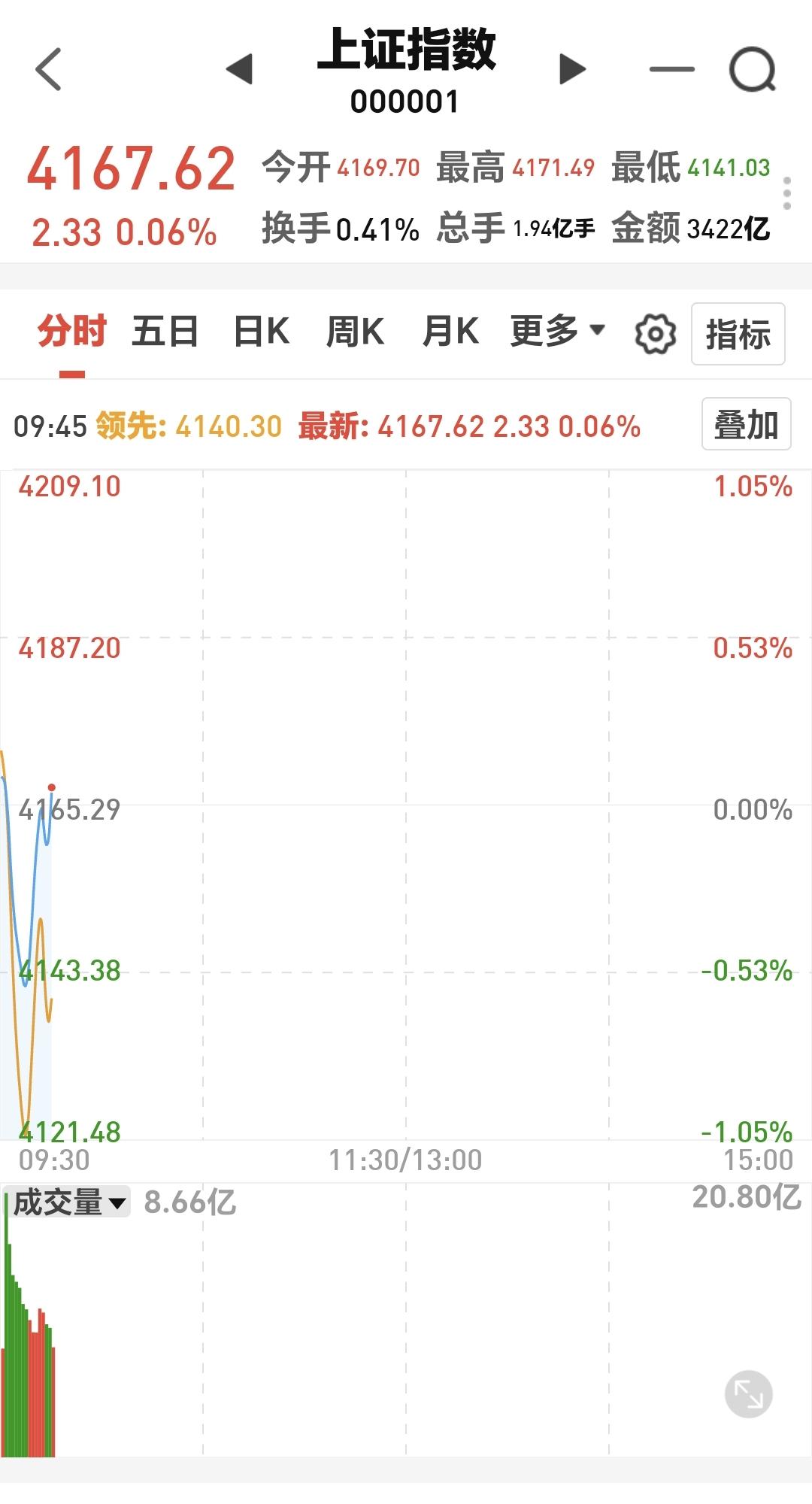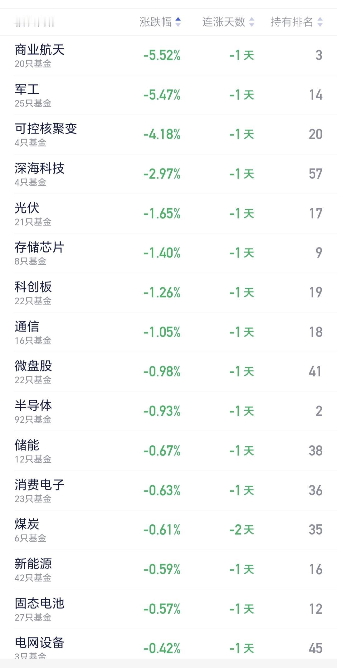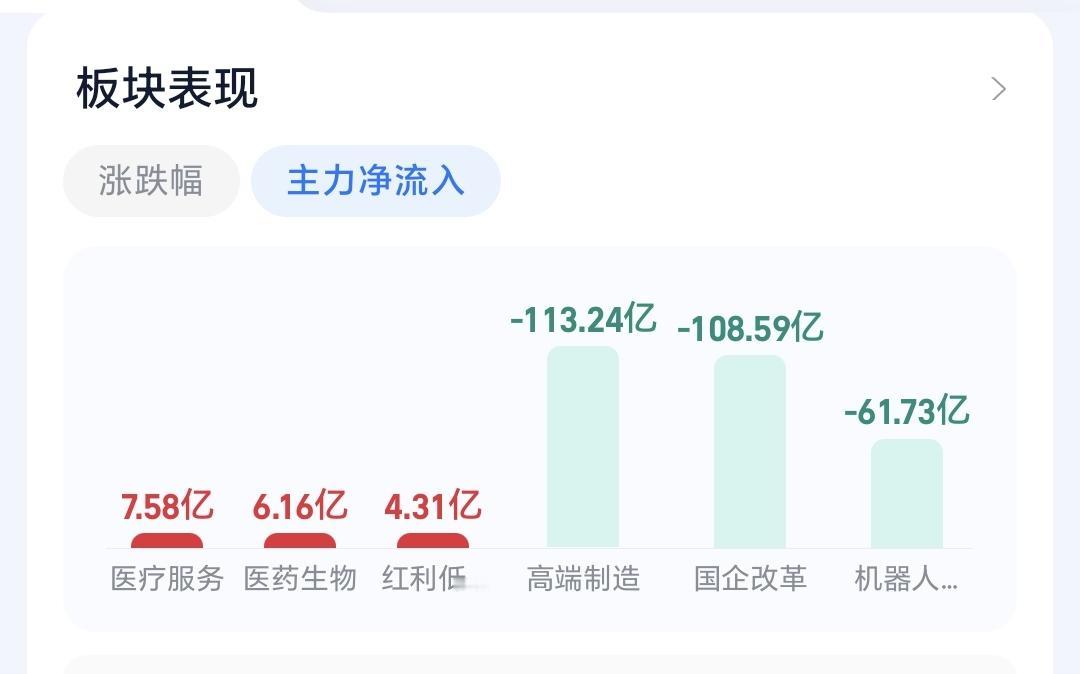 基金:市场短期见顶的信号是什么 今天市场高开,三大指数都是高开,创业板指开盘上涨了0.07%,开于3390点,上证指数开盘上涨了0.11%,开于4169点。 开盘以后指数小幅度震荡,黄色线在蓝色线下方,这是今天盘面的新变化,前段时间大部分都是黄色线在蓝色线上方,所以,今天开始要谨慎对待。 现在两市累计成交9358亿,相比于昨天同期放量了7%,这样的放量幅度是很大的,很多人不理解放巨量的意义,放巨量就是分歧在加大,今天到现在为止还是在放巨量的范围内。 持有的基金中,估值上涨幅度最大的三个板块是:AI应用板块,先进制造板块,兴全合宜,下跌幅度最大的三个板块是:军工板块可控核,聚变板块,白酒板块,估值整体上涨了3279元。 我们来看一下下面的截图8,这是主力资金进出板块的情况,主力资金净流入最多的三个板块是:医疗服务板块,医药生物板块,红利低波板块,主力资金净流出最多的三个板块是:高端制造板块,国企板块,机器人板块,你发现没有,今天资金净流入最多的都是防守类型的板块。 昨天新增加的AI应用和可控核聚变,今天一只上涨,一只下跌,我设置的是每天定投10块钱,主要是观察的需要,不是真正的进场,再一次强调一下。 我们来看一下下面的截图9,这是今天板块上涨幅度排名靠前的板块,上涨幅度前三名的板块是:创新药板块,医疗板块,AI应用板块,我们来看下面的截图10,这是今天下跌幅度排名靠前的板块,下跌幅度前三名的板块是:商业航天板块,军工板块可控核聚变板块,商业航天板块今天下跌幅度排名第一,需要观察成交量是不是放巨量,也就是主力资金有没有从这个板块逃跑,如果主力资金还在,今天的下跌就是洗盘,如果主力资金大幅度出逃,那这里就是高位。 今天盘面分歧加大,主要观察会不会有长上影线,还要观察会不会放巨量滞涨,这些都是短期见顶的信号。 我每天都会分享我的观点,我的观点只代表我个人的看法,不能作为你操作的依据,据此操作后果自负。