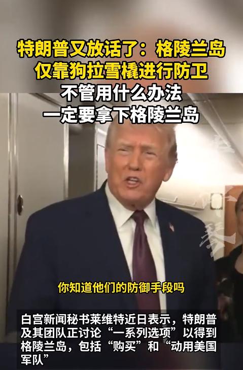 特朗普又出狂言了!当地时间1月11日,直接喊话:“格陵兰岛就靠狗拉雪橇防卫,不管用啥招,美国必须拿下!” 口气大到没边,仿佛格陵兰岛是他超市里随便能买的商品。 不光嘴炮,还亮了底牌。白宫秘书莱维特直接放话,特朗普团队都盘算好了:要么“买”,要么直接派军队抢。 这哪是谈判,分明是强盗上门下最后通牒! 要知道,自2025年上台,特朗普就没放过格陵兰岛,1月4日接受采访时还咬牙切齿说“我们绝对需要它”。 反复念叨,说白了就是盯上了格陵兰岛的北极战略宝地,想靠抢来巩固霸权。 美国的心思,说白了就三个龌龊算盘: 一是踩人抬己,拿“狗拉雪橇”嘲讽格陵兰岛防卫,彻底无视人家的主权。 二是霸权裸奔,把“买”和“抢”摆上台面,没一点大国体面。三是战略算计,死死盯着北极利益,想靠抢格陵兰岛卡住北极格局的命脉。 可惜,时代变了,强盗逻辑行不通了。 格陵兰岛自治意识早醒了,哪能任由美国拿捏? 周边国家也不是吃素的,美国想独吞北极利益,少不了被群起而攻之。 特朗普这波操作,纯属自讨没趣。 把霸权当底气,把侵略当交易,只会让美国的名声更臭。