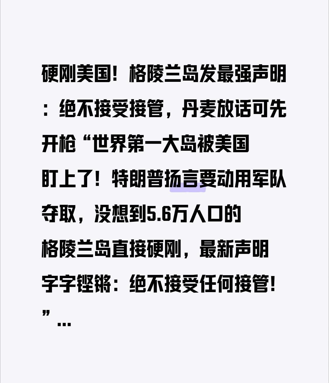 硬刚美国!格陵兰岛发最强声明:绝不接受接管,丹麦放话可先开枪 “世界第一大岛被美国盯上了!特朗普扬言要动用军队夺取,没想到5.6万人口的格陵兰岛直接硬刚,最新声明字字铿锵:绝不接受任何接管!” 这事闹得沸沸扬扬,根源全在特朗普的“夺岛执念”。自从2025年重返白宫,他就没放过格陵兰岛,先是任命专属特使,后来直接放话“美国绝对需要这座岛”,甚至把动武当成备选方案。白宫更传出离谱计划,想给每个格陵兰居民发1到10万美元,让他们脱离丹麦“归顺”美国。 为啥美国这么疯狂?说白了就是两样东西:战略位置和矿产资源。格陵兰岛扼守北极航道,是连接欧美最短航线的关键,美军在这设的皮图菲克太空基地,能监控半个地球的导弹动态。更重要的是,岛上藏着海量稀土、锂矿,这些都是芯片和电动车的核心原料,随着冰层融化,开采难度越来越低,对美国重振制造业来说,简直是块“肥肉” 。 面对超级大国的施压,格陵兰岛没怂!1月12日,自治政府直接发布强硬声明:“任何情况下都不接受美国接管,我们是丹麦王国和北约的一部分,防务只能通过北约框架实现”。总理更是直接喊话特朗普:“够了,别再幻想吞并”,态度坚决到不留任何余地。 更让人没想到的是,背后的丹麦直接亮出底牌。丹麦首相放话“美国动武就是北约终结”,国防部更是硬核表态:如果美军敢强行夺取,丹麦士兵可以“先开枪再请示”。欧洲7国也火速站队,联合声明强调“格陵兰属于其人民,主权不容交易”,连英国前大臣都警告:“吞并盟友领土,西方文明将不复存在” 。 可能有人疑惑,格陵兰岛明明是丹麦自治领地,为啥敢直接硬刚美国?其实这里藏着深层博弈:格陵兰早就有独立诉求,所有政党都支持自决,这次美国的施压,反而让他们更想掌握主动权。而丹麦虽然每年给格陵兰6亿美元补贴,但也靠这块领地维持北极影响力,自然不可能拱手让人 。 美国的算盘其实打得精,想复制当年买阿拉斯加的套路,可现在早就不是领土买卖的时代了。格陵兰岛的稀土矿再值钱,北极航道再重要,也不能用主权来换。更讽刺的是,美国口口声声说“维护盟友安全”,转头就对北约伙伴的领地动起歪心思,这波操作让欧洲盟友彻底寒心 。 这场博弈看似是大国与小岛的对峙,本质上是主权与霸权的较量。格陵兰岛用行动告诉世界:再小的国家和地区,主权也不容随意践踏;再强的超级大国,也不能把别人的家园当成交易品。 从杜鲁门时代想买岛被拒,到现在特朗普动武威胁,美国的野心从未改变,但世界的规则早已不同。每个国家的命运,都该由自己的人民决定,这才是国际社会的底线。 你觉得美国会真的动武吗?格陵兰岛能守住自己的主权吗?评论区说说你的看法,一起为这份硬刚霸权的勇气点个赞~ 格陵兰岛博弈 美国霸权 主权不容侵犯