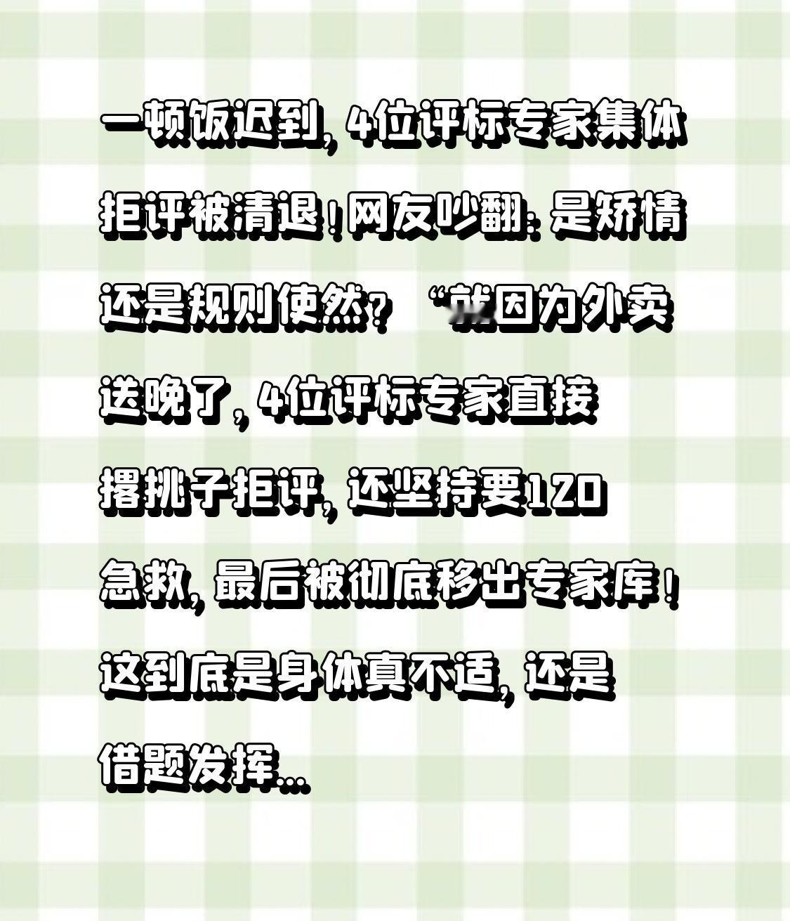 一顿饭迟到,4位评标专家集体拒评被清退!网友吵翻:是矫情还是规则使然? “就因为外卖送晚了,4位评标专家直接撂挑子拒评,还坚持要120急救,最后被彻底移出专家库!这到底是身体真不适,还是借题发挥?” 这事就发生在今年1月4日,青海一场跨省远程评标现场。4位随机抽取的专家正紧锣密鼓评审,可到了饭点,约定的餐食却迟迟没到——原来送餐员送错了地址,一顿饭硬生生延误数小时。 据通报,专家们随后出现低血糖、头晕等症状,即便后来吃上了饭,仍坚持说身体不适,要求呼叫120急救,明确拒绝继续评标。无奈之下,招标人只能重新抽专家,整个项目评审被迫中断。最终青海省数据局出手,依据“入库专家须身体健康,具备正常履职条件”的规定,直接把这4位专家清出了省综合评标专家库 。 消息一出,全网直接吵翻!支持清退的网友说:“评标要扛高强度工作,可能熬夜加班,身体差成这样根本不适合当专家,这是对项目负责”;反对的网友却质疑:“4人集体不适还非要120,未免太矫情,会不会是不想评故意找借口?” 但吵归吵,这事其实撕开了评标工作的真实痛点。看似是“一顿饭的矛盾”,实则暴露了保障漏洞:评标专家被封闭管理,不能随意进出,可青海这边连送餐路线都没核实,连基本的备用餐食都没有,对比济南、西安等地,人家早就明确了专家就餐时间、专属餐厅,甚至还准备减脂餐、应急食品柜 。更关键的是,评标专家实行终身负责制,签字就要担责,高强度工作下,后勤保障和医疗应急本就该跟上,总不能让专家饿着肚子硬扛吧? 不过反过来想,专家的做法也有争议。评标不是儿戏,关乎项目公平和公共利益,就算餐食延误,是否有更稳妥的解决方式?比如先协调应急食品,而非直接拒评。而且按照规定,专家入库前就该确保身体能胜任,真有基础病也该主动退出,不能等出事才暴露问题。 其实这事没有绝对的对错,却给所有人提了个醒:规则的刚性和人文的温度,从来都不该对立。评标工作要严谨,专家身体条件要达标,这是底线;但后勤保障也得跟上,让专家能安心履职,这是基础。就像西安的评标现场,既守得住“八个严禁”的规矩,也做得到菜单贴心搭配,这才是双赢 。 生活里也一样,很多矛盾看似突发,其实都是细节没做到位。你觉得这4位专家该被清退吗?是保障不到位还是专家太矫情?评论区说说你的看法,一起聊聊规则与人情该怎么平衡~ 评标争议 社会热点 规则与人情