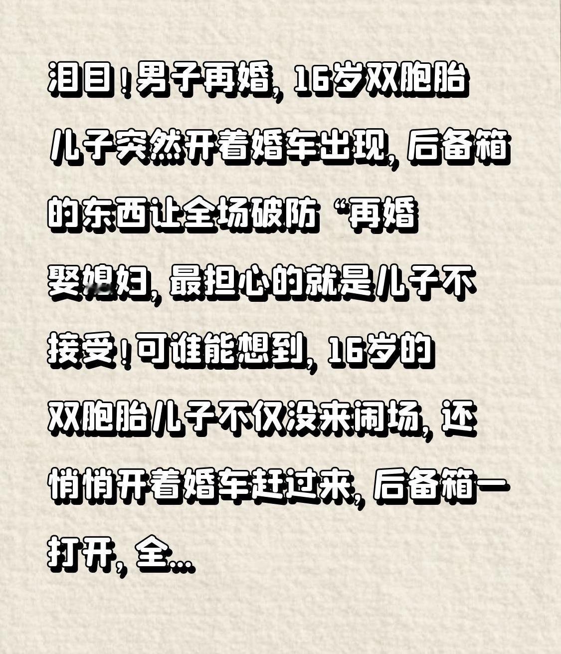 泪目!男子再婚,16岁双胞胎儿子突然开着婚车出现,后备箱的东西让全场破防 “再婚娶媳妇,最担心的就是儿子不接受!可谁能想到,16岁的双胞胎儿子不仅没来闹场,还悄悄开着婚车赶过来,后备箱一打开,全场长辈都红了眼!” 新郎老陈今年42岁,和前妻分开5年,独自拉扯双胞胎儿子长大。去年经人介绍认识了现在的妻子王姐,两人感情稳定,可一提到再婚,老陈就犯愁——两个儿子正处于叛逆期,之前提过找对象的事,兄弟俩直接摔门而去,说“谁也替代不了妈妈”。 婚礼当天,老陈特意没让儿子们来接亲,怕兄弟俩闹情绪扫了大家的兴。看着身边温柔的新娘,他既幸福又愧疚,总觉得亏欠了儿子,也委屈了眼前人。接亲车队准备出发时,老陈忍不住频频回头,心里空落落的,想着“只要儿子们好好的,不理解也没关系”。 就在车队要启动的瞬间,一辆熟悉的白色轿车突然拦在前面,车门打开,穿着同款黑色衬衫的双胞胎儿子走了下来!兄弟俩个子高挑,脸上带着少年人的青涩,手里还捧着两个红色礼盒,径直走到老陈面前。 “爸,我们来送你和王阿姨。”大儿子声音有点哽咽,小儿子赶紧补充:“婚车我们早就订好了,比你找的车队更配你!”老陈愣在原地,眼泪瞬间涌了上来,他以为儿子们会记恨,却没想到他们早有准备。 更让人破防的是后备箱!兄弟俩把妈妈的照片放在最前面,旁边是绣着“平安喜乐”的新枕头,还有一封手写的信:“爸,我们知道你一个人不容易,王阿姨对我们很好,我们不反对你再婚了。妈妈在天上也希望你幸福,这个枕头给你和王阿姨,以后我们就是一家人,一起好好过。” 全场宾客都被这一幕打动,有人悄悄抹眼泪,王姐走上前抱住两个儿子,哽咽着说:“谢谢你们愿意接纳我,以后我一定像亲妈一样疼你们。”兄弟俩第一次主动抱住王姐,小声说:“王阿姨,以后也请你多照顾我爸。” 都说重组家庭难,可真正的爱从来不是血缘的绑定,而是彼此的理解和包容。16岁的双胞胎用最真诚的方式,告诉我们:孩子要的不是完整的家庭,而是父母的幸福和不被忽视的爱。 老陈的婚礼没有奢华的排场,却有着最动人的温情。其实幸福很简单,无非是你懂我的不易,我体谅你的难处,一家人互相扶持,朝着同一个方向努力。 如果你也被这对双胞胎打动,评论区留下“幸福长久”,一起祝福这一家人!也说说你对重组家庭的看法,让我们一起为这份难得的温情点个赞~ 重组家庭 亲情 暖心瞬间
