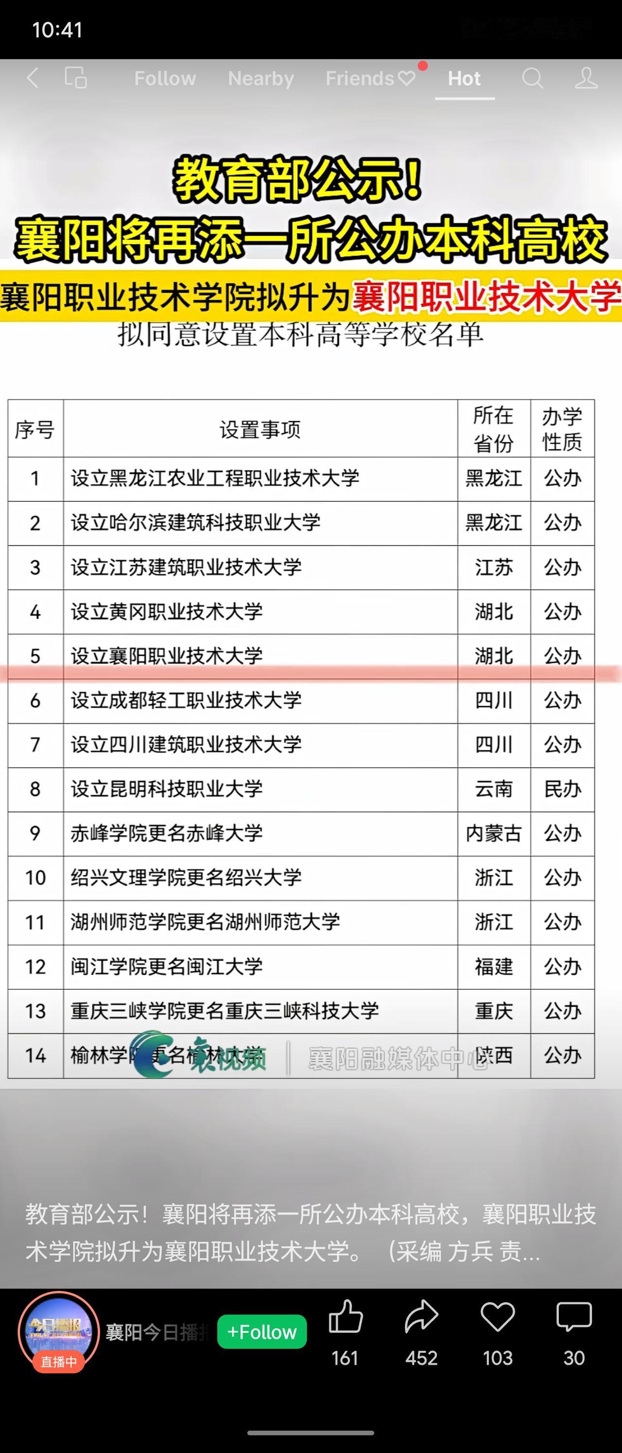 教育部公示,拟同意将襄阳职业技术学院升格为本科层次的“襄阳职业技术大学”。公示期为2026年1月12日至16日。这意味着湖北省襄阳市即将新增一所公办本科高校。