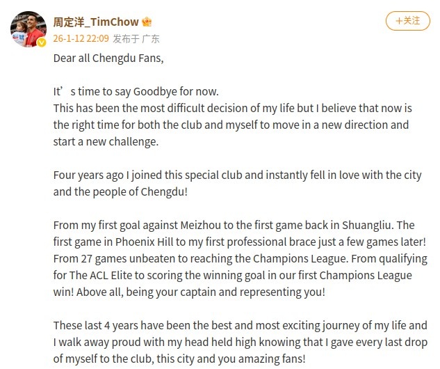 值得一提的是,在周定洋昨日社媒发文告别蓉城时,IP显示球员目前正在广东,综合直播吧报道以及相关传闻,球员大概率将为新鹏城出战新赛季。