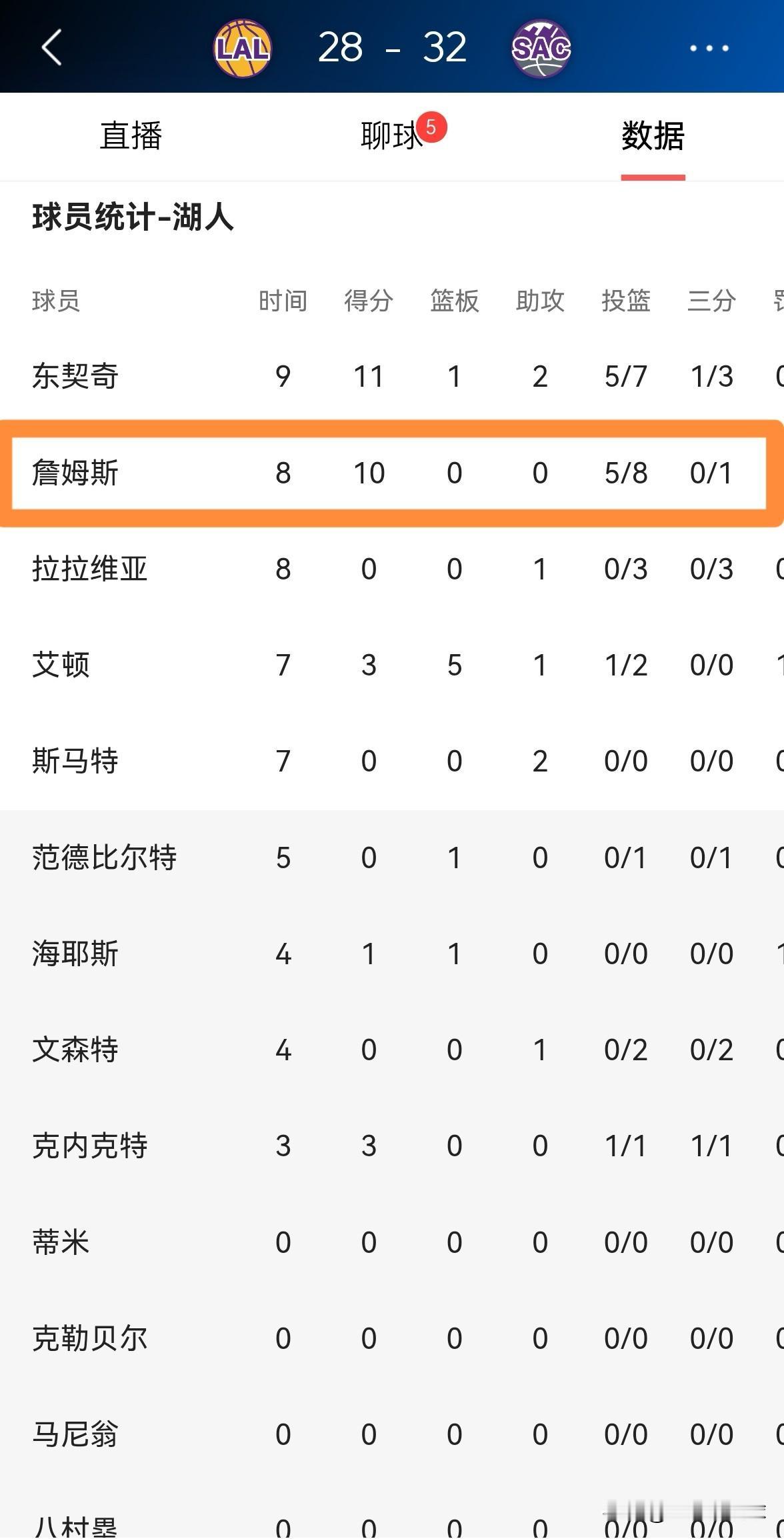 湖人超级巨星詹姆斯真是让人赞不绝口!在今天湖人客场挑战国王的比赛中,目前双方的第一节比赛已经结束,虽然湖人以28:32落后于对手,但是詹姆斯却打出了让人赞叹的表现。 在第一节比赛中,41岁的詹姆斯首发出战8分钟,投篮8中5,其中三分球1中0非常高效的砍下10分,他的场上正负值为+1。 值得一提的是,从比赛开场以后詹姆斯就展现出了超强的进攻欲望,展现出了必胜的信念。