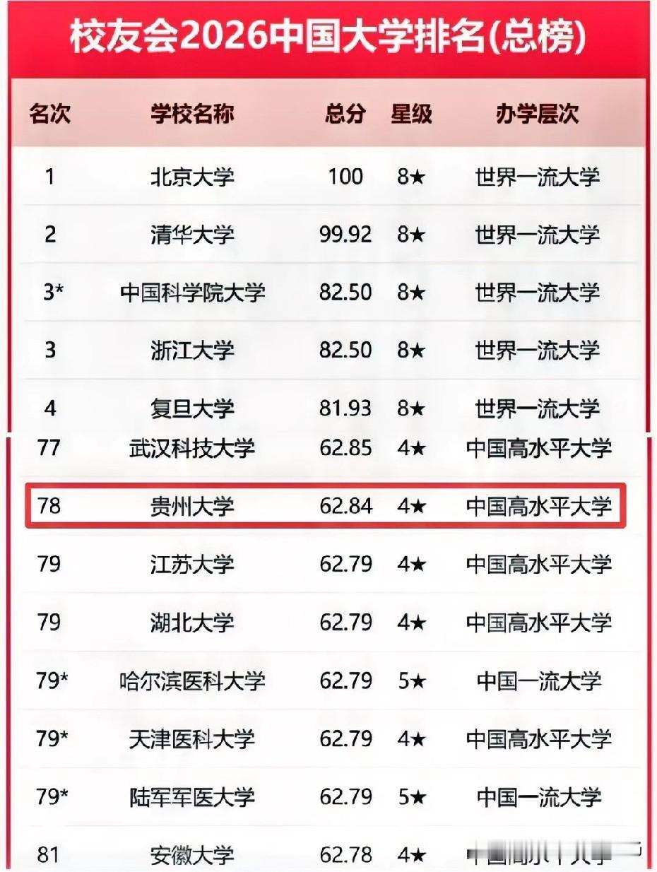 贵州大学这么牛了,可喜可贺!近日,校友会发布2026中国大学排名,贵州大学以强劲发展势头跃居第78位,实现历史性跨越!作为西南地区重要高校,贵大近年来深耕学科建设、聚焦科研创新,在人才培养与社会服务上持续发力。这一排名不仅印证了其“后发赶超”的实力,更彰显了西部高等教育崛起的加速度。为贵大点赞,期待继续乘风破浪,培育更多英才,助力区域高质量发展! (图片来源于网络) 中国大学实力榜 西南高校排名 贵州大学 贵州各大学