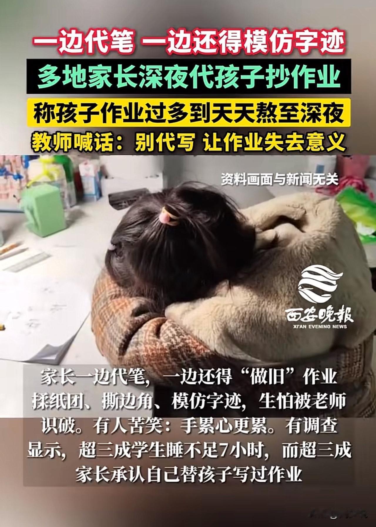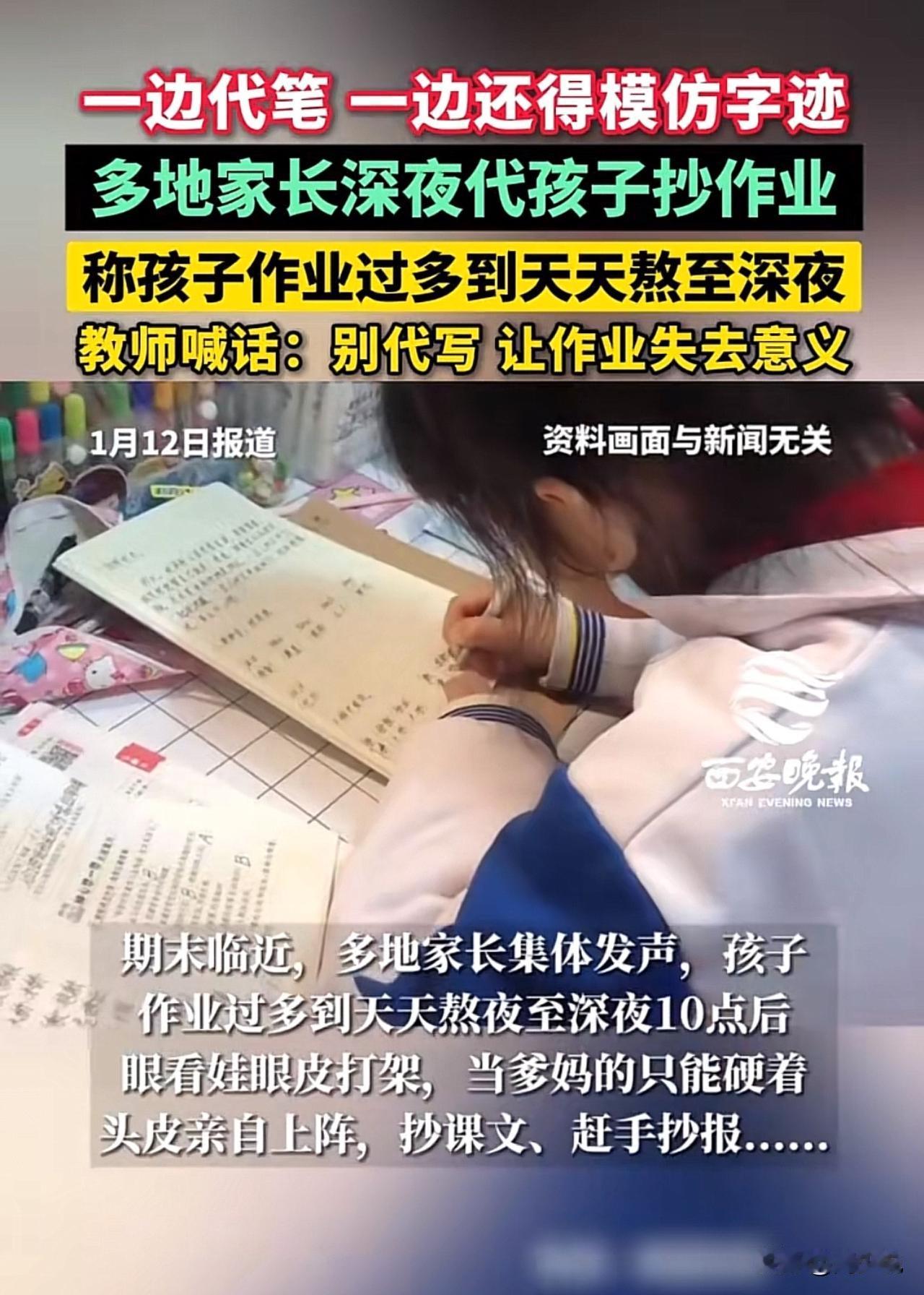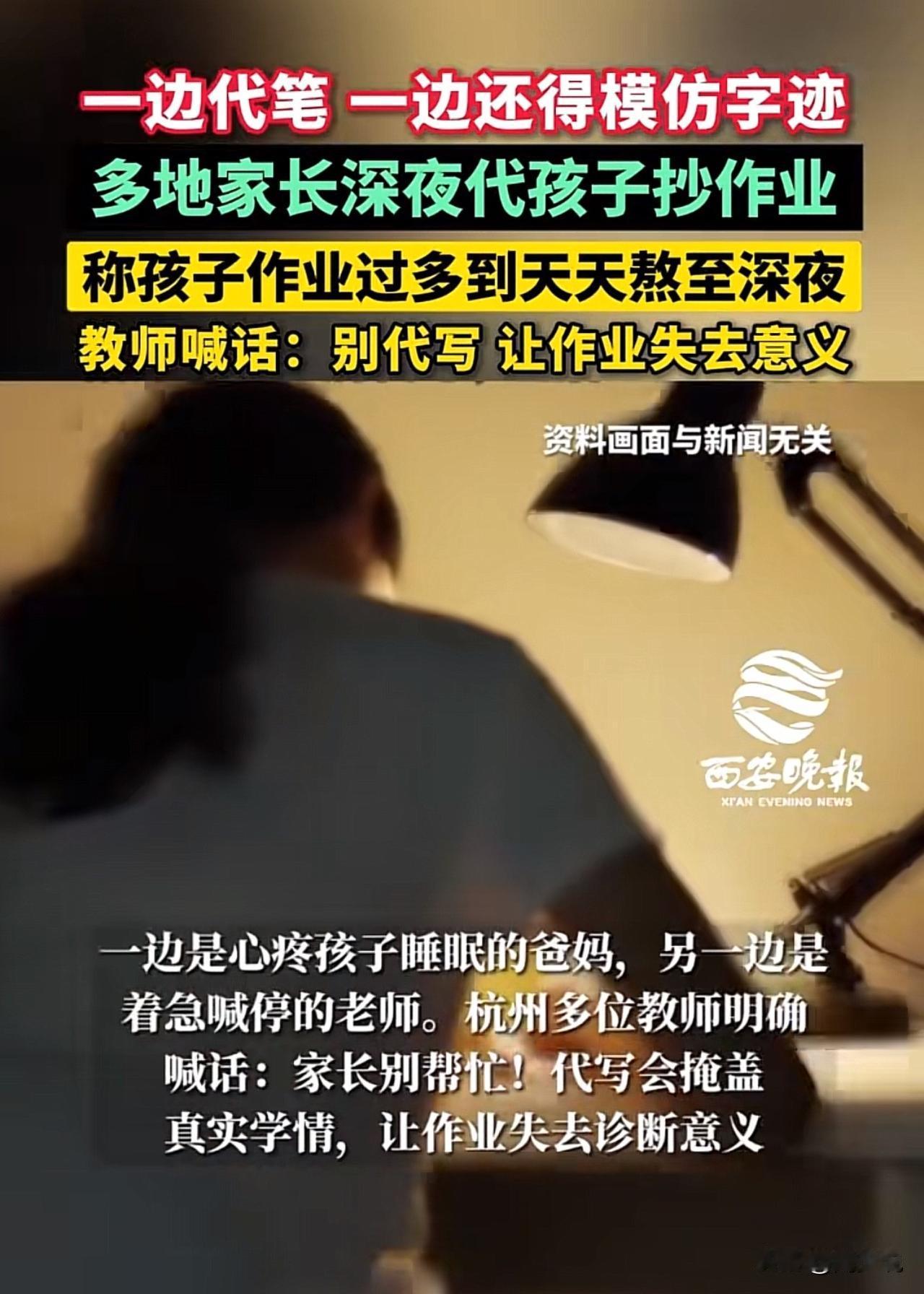 “多名家长深夜代抄作业!”据媒体报道,近期多地家长深夜代抄作业的现象,一边盯着孩子熬红的眼,一边握着笔模仿孩子字迹赶作业。不少家长吐槽,孩子作业多到天天熬到深夜,实在心疼才出手代劳,不写怕挨批,写又熬垮娃,进退两难。此视频曝光后,在社交平台引发热议。 此事网友们看法不一,有网友感慨:“太懂这种无奈了,孩子写到凌晨还没结束,大人不帮忙根本扛不住!” 也有网友指责:“代写不可取,会让孩子养成依赖,作业的查漏补缺作用全没了。” 教师也公开喊话:别代写,这会让作业失去原本的意义。 看完这事,周少都被惊艳到了,没想到竟然有这么多家长代替孩子写作业,属实难以置信。作业的初衷是巩固知识、培养习惯,绝非“熬鹰式”的机械抄写。 家长代抄看似心疼孩子,实则是在掩盖“作业量超标”和“教学方式僵化”的问题,更会让孩子失去直面压力、合理规划时间的锻炼机会。 教育不该是“拼时长”的消耗战,唯有优化作业设计、把控作业总量,才能让孩子真正从作业中受益,而不是让家长和孩子都陷入深夜赶工的疲惫里。#寻美三湘# #长沙新朋友#
