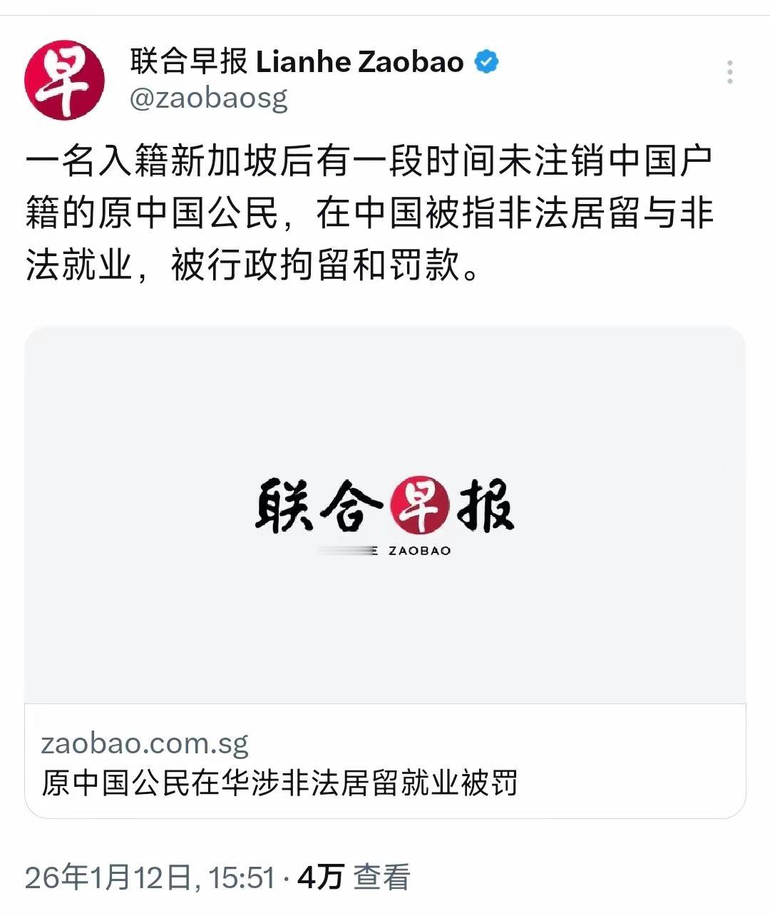 新加坡联合早报1月12日报道:“一名入籍新加坡后有一段时间未注销中国户籍的原中国