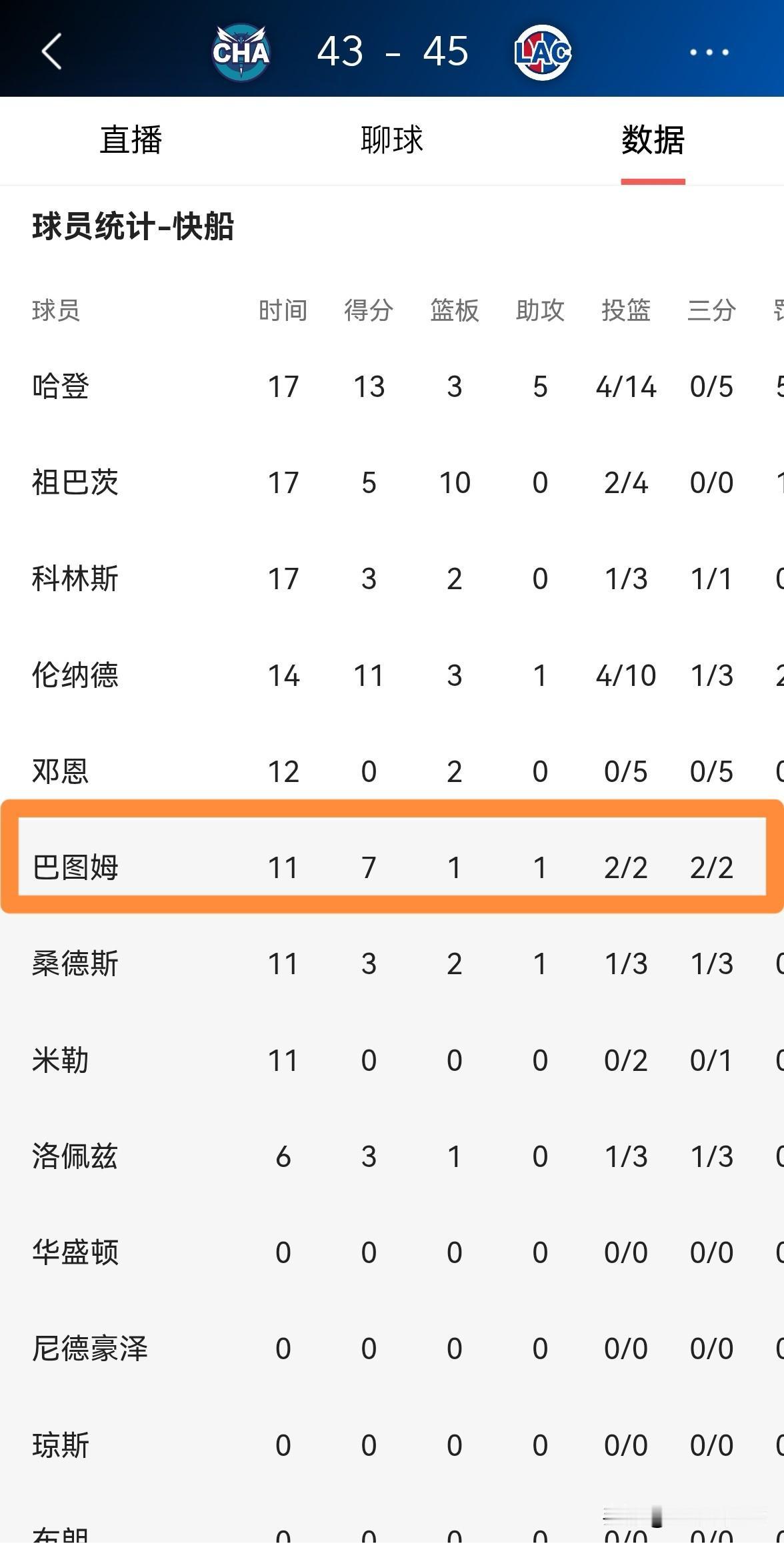 我必须要怒赞快船老将巴图姆!在今天快船主场迎战黄蜂的比赛中,目前双方半场战罢,快船以45:43领先对手2分。在前两节比赛中,巴图姆替补出战11分钟,三分球2中2,其中罚球2中1得到7分,还有1篮板1助攻2抢断,他的场上正负值为+1。 老实说,虽然巴图姆已经37岁了,但是他依然是快船第二阵容的绝对核心,他依然能够在攻防两端为球队提供非常大的帮助。