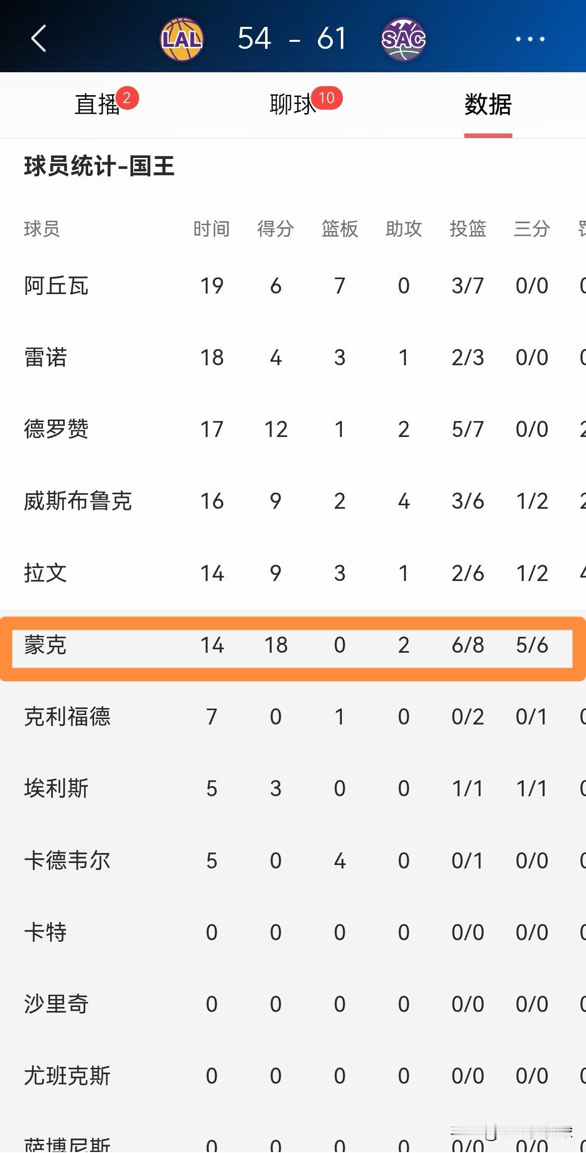 国王大将蒙克真是太不给老东家面子了!在今天国王主场迎战湖人的上半场比赛中,蒙克面对旧主火力全开,他在替补出战的14分钟里,投篮8中6,其中三分球6中5、罚球1中1爆砍18分,还有2助攻,他的场上正负值为+8。 在上半场比赛中,蒙克真是彻底的杀疯了,他丝毫没有给老东家湖人留情面。