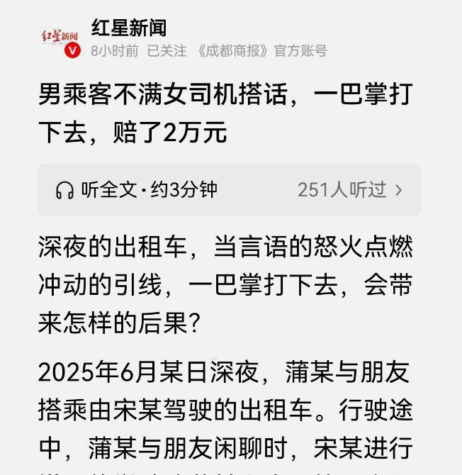 湖北恩施,一女出租车司机,在深夜搭载了两名男乘客。 就因为她多说了几句话,被乘客一巴掌打进了医院,住了整整16天。 事情发生在去年6月的一个深夜。女司机宋大姐开着出租车在路上揽活,这时候两名男乘客,蒲某和他朋友,招手上了车。 路上,两个男乘客聊得热火朝天。宋大姐性格开朗,听着他们聊,就顺着话题插了几句话,发表了自己的看法。 她本意就是凑个热闹,觉得路上聊天能解闷。可万万没想到,就这么几句搭讪,把乘客蒲某给惹火了。 蒲某突然发怒,一把抓住宋大姐的头发,朝着她的脸狠狠扇了一耳光。 这一巴掌打得不轻。宋大姐后来被医院诊断为脑震荡,身上还有多处软组织损伤,耳朵也一直嗡嗡响。她为此住院治疗了16天,才算缓过来一点。 出院后,她找打人的蒲某要求赔偿。但对方不理不睬,一分钱都不愿意给。 协商不成,宋大姐一怒之下,把蒲某告上了法庭,要求他赔偿医疗费、误工费等各项损失,总共两万多块钱。 有网友就说,出租车司机最好别搭话,精神集中开车就好。有的司机开车听评书还放很大声,乘客提意见还搞得不高兴。车内环境干净安静最重要。 也有网友认为,就因为聊天观点不合就动手打人,这戾气太重了。打人绝对解决不了问题,既把别人打伤了,自己也得承担法律责任,赔钱是跑不掉的。遇事还是得冷静。 这件事,说到底就是一句话惹的祸。司机或许觉得搭话是热情,但乘客可能觉得被冒犯。 动手打人肯定是大错,无论如何都不该打人。但这也给所有人提了个醒,和陌生人交流,要注意分寸,看清对方是否愿意接话。 一巴掌下去,打人者要赔钱吃官司,被打者身体受苦还耽误挣钱。两个陌生人的命运,因为几句不经意的话,就彻底改变了。 有时候,沉默是金,尤其是面对不熟悉的乘客时。安全把客人送到地方,才是司机最该做好的本分。