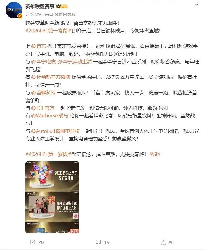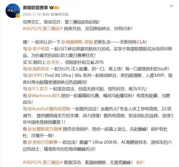 LPL去年/今年赞助商对比:从10家减至7家。 LPL联盟在今天中午公布了2026第一赛段的赞助商,共计7家赞助商。相比去年第三赛段,赞助商数量从10家减至7家。 2025LPL第三赛段赞助商: 梅奔、李宁、京东、莫斯利安、OPPO、TCL、战马、傲风、杜蕾斯、英特尔。 2026LPL第一赛段赞助商: 京东、李宁、杜蕾斯、首驱、TCL、战马、傲风。 从2025年到2026年,曾与LPL联盟合作多年的“梅奔”、“莫斯利安”、“OPPO”、“英特尔”等品牌退出赞助商行列,这或许侧面反映LPL影响力正在逐渐减弱。
