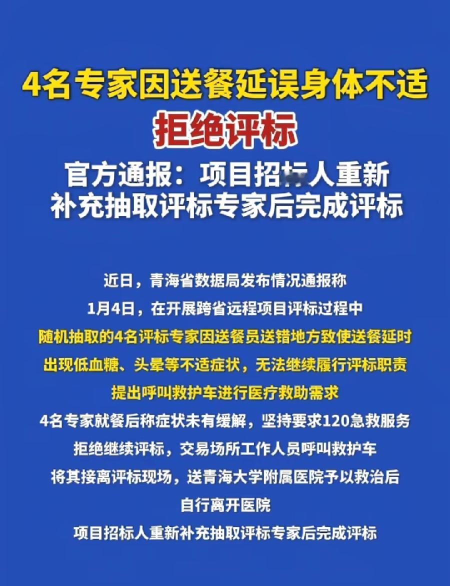 青海4名专家低血糖拒绝评标,两种可能情况:1、巧到家了,2、装病不想评、不敢评,标太大,坑太深!评标钱也不要了,冒着被解聘的风险!送餐吃饭晚了,4人都是低血糖头晕,不能评标可以理解,4人吃完饭都还没好?4人都叫了120都还没好?4人都还拒绝继续评标?!随机抽取4人大概率彼此不认识,当场约好,走为上计!现在专家也难!