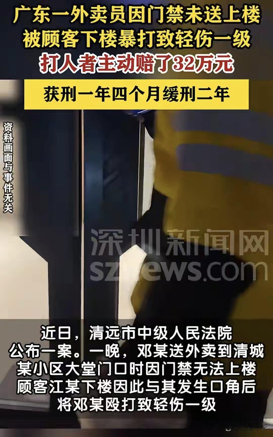 外卖小哥躺赚32万,外卖小哥因门禁未上楼送餐,被顾客殴打,事后打人者主动赔偿32万,并获刑一年四个月,缓期两年执行。送三年外卖也没有挨这一顿打挣得多,有人喊话这名顾客,自己一顿是要30万,打几顿都行,真是什么都开始卷了。
