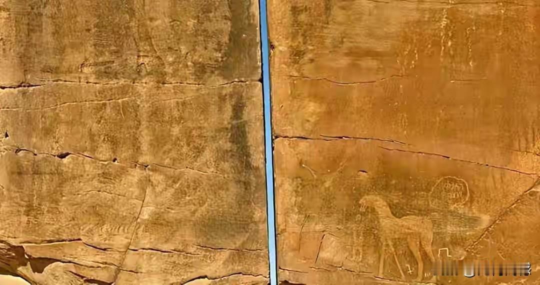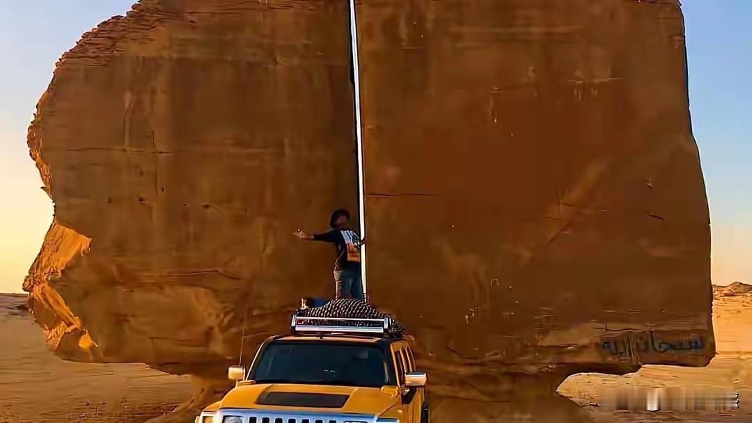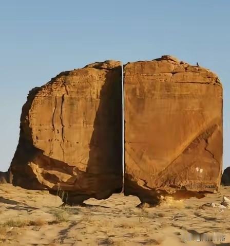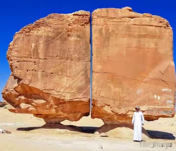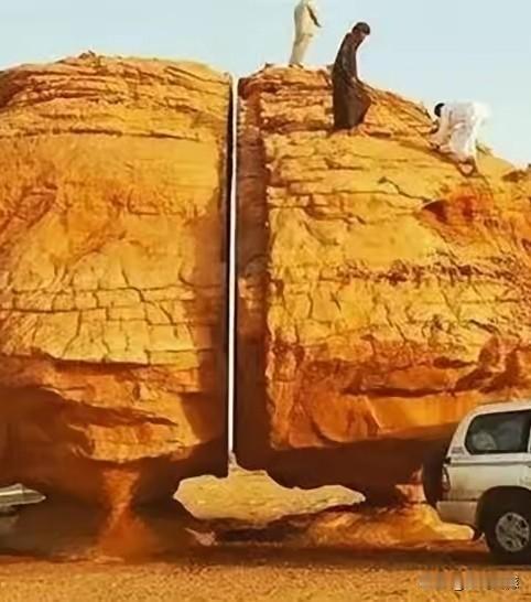 这块块石头中间的裂缝真是太奇特了,整块石头6米多高,裂缝从上到下贯穿到底,上下宽度几乎是一样的,整条裂缝就像是用现代工具切割出来的一样,裂缝非常的光滑,到目前为止,专家都不知道到底是怎么形成的,这两块石头座落在沙特阿拉伯的泰玛绿洲之上,在石头表面上还刻有许多动物形象和符号。