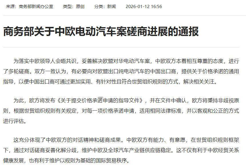 价格承诺替代关税,中欧就中国电动车出口争端达成一致。 怎么理解? 1、35.3%的电动汽车额外关税,没了,中国电动车出口压力减小。 2、没有了关税压力,但,中国纯电动汽车出口商必须向欧盟提交价格承诺书,直接与布鲁塞尔协调其最低价格,承诺书列明的内容不仅包括最低价格,还有销售渠道、交叉补贴的情况以及未来在欧盟的投资计划等信息。很明显,欧盟不允许中国电动车以低价取胜,是保护欧洲本土汽车产业的举措。 3、受此影响,中国电动车在欧洲市场的销量表现短期内或受挫,需持续提高产品竞争力或在欧洲本土投资建厂。 4、中国已有车企在欧洲建厂,如比亚迪等,同时中国电动车产业有成熟性优势,是中国与欧洲就电动车出口争端达成一致的底气。 附:中国商务部发文: “为落实中欧领导人会晤共识,妥善解决欧盟对华电动汽车案,中欧双方本着相互尊重的态度,进行了多轮磋商。双方一致认为,有必要向对欧盟出口纯电动汽车的中国出口商,提供关于价格承诺的通用指导,以便中国出口商可通过更加实用、有针对性且符合世贸组织规则的方式,解决相关关注。” “为此,欧方将发布《关于提交价格承诺申请的指导文件》,并在文件中确认,欧方将秉持非歧视原则,根据世贸组织规则有关规定,对每一项价格承诺申请,适用相同法律标准,并以客观和公正的方式进行评估。”【来自懂车帝车友圈】