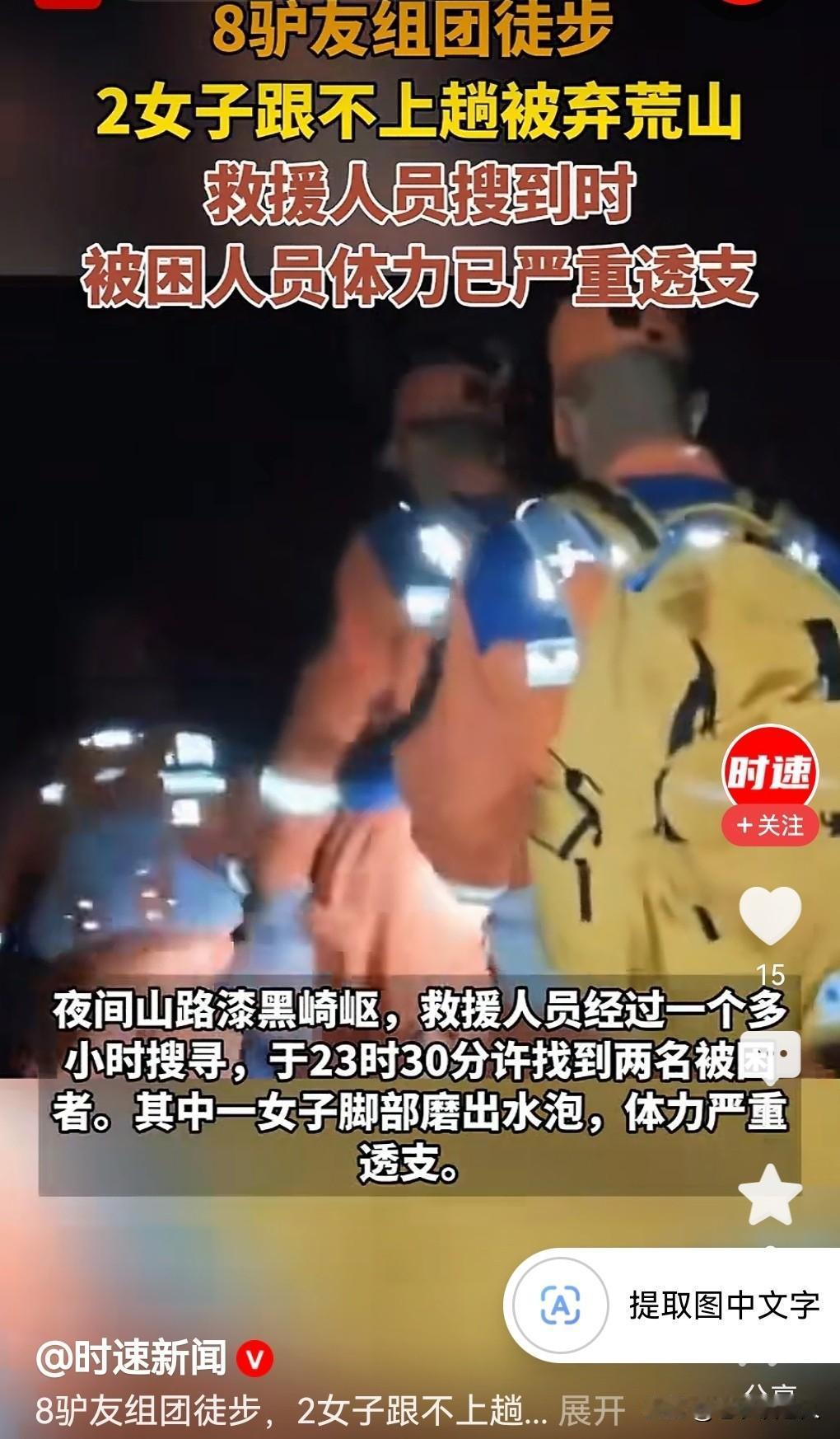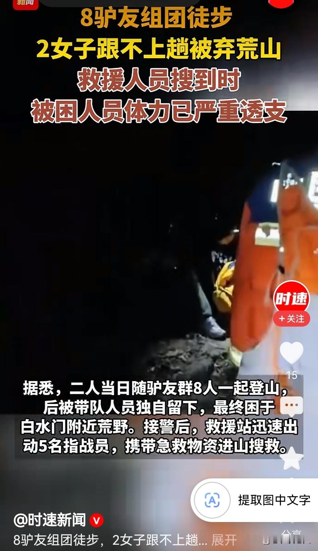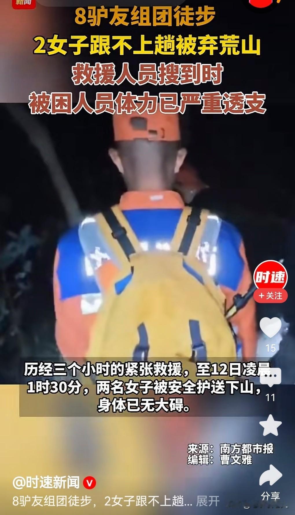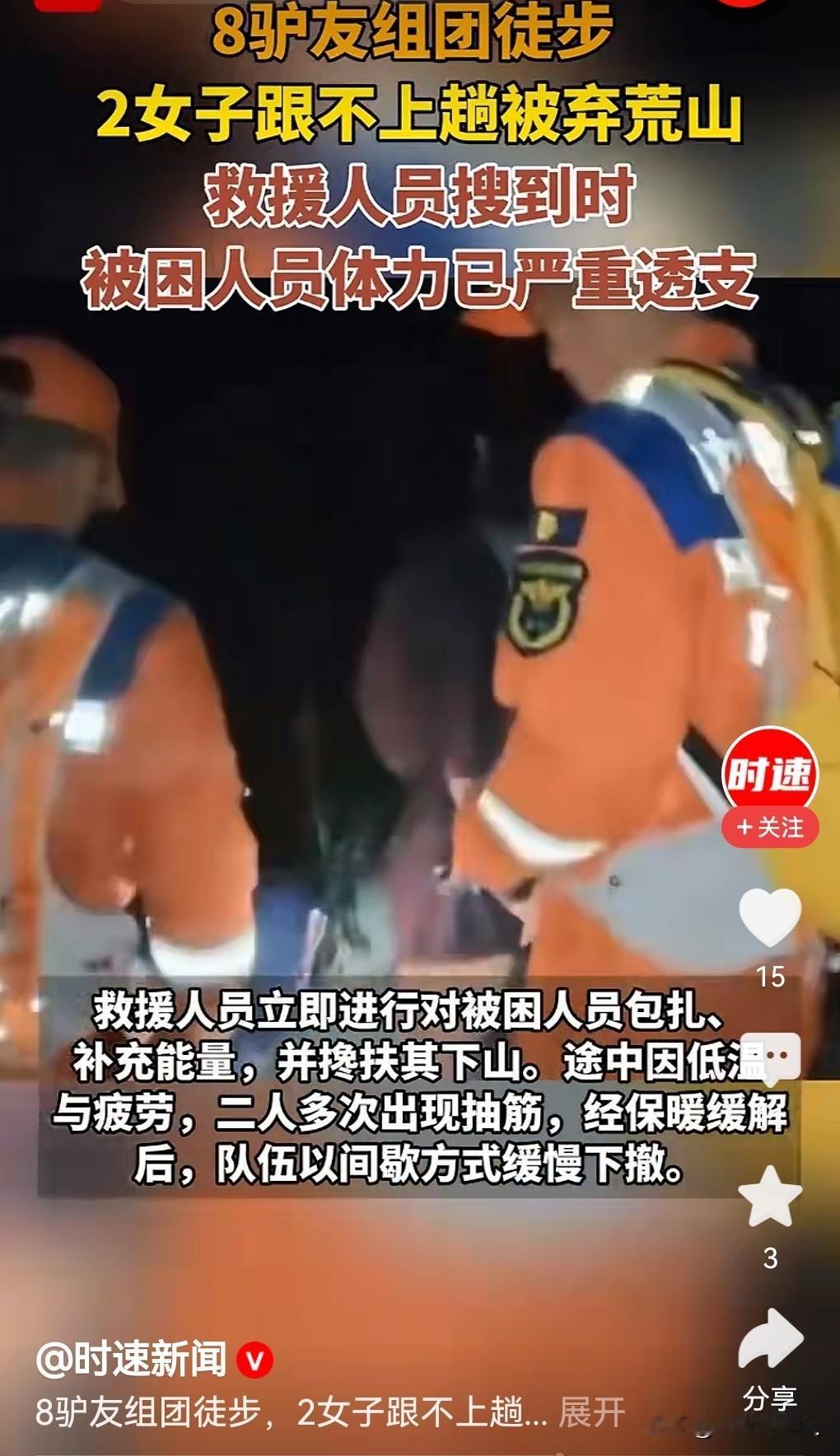 体弱老人徒步登上不要莽撞,量力而行以防不测 8名驴友组团的徒步队伍,出游登山,有2女子因在返回途中,体力不支,跟不上趟,被队友抛弃荒山。报警求援后,救援人员搜到时,被困人员体力已严重透支,情况十分危急。 据媒体报道,1月11日晚,广东省惠州市朱明洞消防救助站,接到求救报警信息,有两名女子,在惠州罗浮山画鱼线徒步的时候,因年老体衰,身体瘦弱,体力不支,被6名队友抛弃荒山野岭后而困。 据被困两名驴友介绍说,她二人当日是随驴友微信群的八人临时所组成的登山队伍,一起出游登山。 在返回的时候,因体力跟不上,总是拖队,走在队伍的最后。后来被带队人员发现她俩跟不上趟,便将她俩独自留下。 她俩开始大距离的掉队,始终赶不上大部队,最终被困于白水门附近荒野,因体力不支,实在走不动了,只好求救于警方。 朱明洞消防救助站接警后,救助队员迅速出动5名指战员,快速携带急救物资,进山紧急搜救。 夜间山路漆黑一团,崎岖陡峭的山间羊场小路百折千回,救援人员经过一个多小时仔细搜寻,直至23:30许,才找到两名被困人员,其中一女子脚跟部位已经磨出了水泡,走路非常困难,加上体力严重透支,又渴又饿,根本无法下山。 救援人员找到被困两女子后,立即对被困人员受伤处进行包扎,给水给食物,补充能量。当她俩恢复体力的时候,搜救队员们搀扶她俩下山。 在下山的途中,因夜晚气温低与身体疲劳,她俩多次出现抽筋,通过给她俩保暖缓解以后,队伍以间歇方式缓慢下山。经过三个小时的紧急救援,直至次日凌晨1:30,两名驴友才被救助站人员安全护送下山,目前身体已无大碍。 在此,通过此事例,劝告喜欢爬山运动的老人们,一定要注意,一是选择徒步爬山的路程,不是那么遥远,能够两三个小时就能返回为宜,不要选择去太过于遥远的地方活动,避免出现体力不支,缺失补给,很难返回等等不测事情的发生。 二是选择出游的队伍,一定是自己的亲朋好友熟悉的人,有爱心有团队精神的队友,千万不要选择不认识的陌生人一起徒步,避免途中抛弃和离队。 三是徒步出游,一定要选择熟悉的地方,不熟悉的地方,必须要有向导来领队,否则不能擅自出游,避免迷失方向,很难找到返回的路线。 以上是本人观点,如有不妥,请大家在留言区,留下你宝贵的意见,并积极参与评论,特邀请大家一起探讨老人锻炼身体的问题。