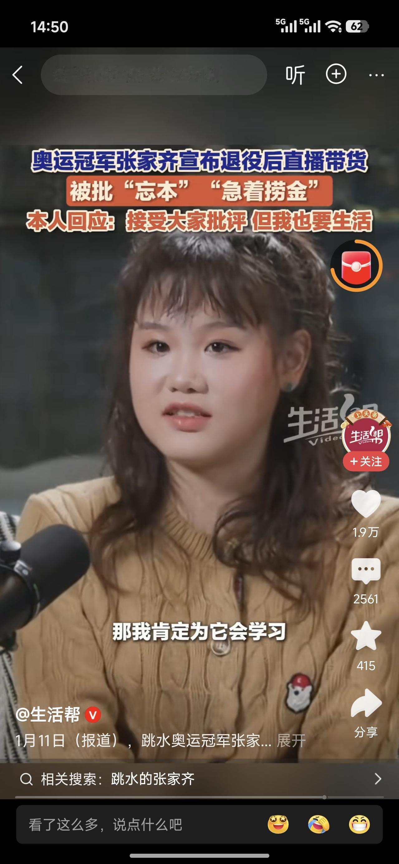 奥运冠军不能当饭吃,张家齐说,准备做这个工作了,就接受大家的批评,但奥运冠军也要吃饭的,这没毛病。我支持。 明星都能带货,体育明星比明星更不容易,为啥不能带货。 记得好多年前有个举重冠军,长期训练,雌激素下降的厉害,退役后在澡堂给人搓澡。她说自己没有一技之长。 难道非要过这样的日子,才能说明他们洁身自好吗?时代变了,谁都可以带货,只要你能卖出去。那是个人的本事。