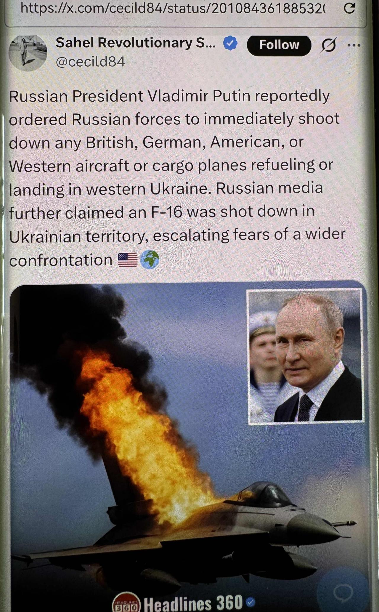 惊爆,普京暴怒!立即击落欧洲飞机! 据称俄罗斯总统弗拉基米尔·普京下令俄军,立即击落任何在乌克兰西部进行加油或降落的英国、德国、美国及其他西方国家的军机或货运飞机。俄罗斯媒体进一步宣称,一架F-16战机在乌克兰境内被击落,这加剧了人们对冲突进一步扩大的担忧。 这次击落并非偶然,而是俄军防空体系与战术准备的必然结果。俄军现役的S-300系统已完成数字化升级,配合后方A-50预警机的数据链支持,对非隐身战机的探测和锁定能力大幅提升。哪怕F-16试图利用低空地形杂波掩护突防,也难以避开俄军的补盲雷达网。 乌军F-16的自身短板也放大了战败风险,乌克兰接收的F-16并非美军顶配版本,而是欧洲国家清理库存的中期寿命升级型。这些战机的雷达航电水平停留在世纪之交,仅能支持基础弹药挂载。在低空飞行时,老式机械扫描雷达受地面杂波影响严重,飞行员几乎处于半盲状态执行任务。 回到西方军机可能被击落的传闻本身,其背后反映的是俄乌冲突的核心矛盾升级。近期英法等国公开表态,计划在俄乌达成和平协议后向乌克兰部署部队。俄罗斯方面立刻做出强硬回应,明确指出西方国家在乌克兰部署的军事单位和设施,都将被视为合法作战目标。 俄方的强硬态度有着清晰的逻辑链条,俄罗斯外交部长拉夫罗夫此前就曾强调,欧洲军队部署到乌克兰,等同于北约正式介入冲突,俄方绝不可能允许这种情况发生。俄总统新闻秘书佩斯科夫也批评西方领导人的相关言论具有极强的对抗性,认为西方更关心延续战争而非推动和平。 西方对乌的军事援助正在不断突破俄方红线,除了F-16战机,英国近期还追加2亿英镑援助,专门用于为乌克兰提供防空装备和弹药。但这些援助难以从根本上改变战局。乌克兰防空系统当前面临系统性短缺,西方导弹库存耗尽,先进装备覆盖范围有限,2亿英镑的援助仅能带来局部、暂时的提升。 欧洲内部对援乌的分歧也在加剧,匈牙利总理欧尔班明确拒绝欧盟为乌克兰募集资金的计划,直言向乌克兰拨款8000亿欧元将导致欧洲经济死亡。欧尔班指出,部分西欧领导人的战争狂热正在将整个欧洲推向危险境地。这种分歧让西方对乌援助的持续性打上问号。 一架F-16的坠落,不仅打破了美制武器的神话,更让冲突扩大的风险具象化。此前被西方寄予厚望的M1坦克,在乌克兰战场已损失惨重,31辆援助坦克半年内被击落27辆。这些装备的接连失利,证明单纯的武器援助无法逆转战场态势。 当前局势的危险之处在于,双方的对抗正在不断突破底线。俄军已开始动用具有战略属性的“榛树”高超音速导弹执行打击任务。这种导弹突防能力极强,目前没有反导系统可以有效拦截。俄方的意图很明确,就是通过展示战略威慑力,迫使西方停止对乌的军事支持。 外界担忧的冲突扩大,本质是北约与俄罗斯的直接对抗风险。如果西方军机真的直接参与对乌军事支援,包括在乌克兰西部加油或降落,就意味着北约对冲突的介入从“间接”转向“直接”。这种情况下,俄军的击落行动将成为大概率事件,冲突范围也将彻底超出乌克兰境内。 截至目前,各方仍在试探彼此的红线。俄罗斯的核心诉求始终是阻止北约东扩和军事力量逼近边境。西方则试图通过援助乌克兰消耗俄罗斯。这种博弈让俄乌冲突陷入长期化、僵持化的困境。 对于普通民众而言,冲突扩大意味着更多的人道主义灾难和经济冲击。欧洲已为援乌付出巨额成本,援助总额远超美国,但这些投入正在逐渐变成沉没成本。能源价格波动、通货膨胀高企,欧洲民众已开始承受冲突带来的直接后果。 总结来看,“普京下令立即击落欧洲飞机”的传闻虽未证实,但俄方的强硬立场真实可感。F-16的击落是这种立场的直接体现,也是对西方持续援乌的明确警告。后续局势的走向,取决于西方是否愿意收敛对乌的军事支持,是否愿意回到谈判桌前解决分歧。任何进一步的挑衅动作,都可能让冲突走向无法挽回的扩大境地。