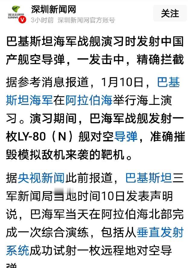 巴基斯坦又扬眉吐气了? 近日,巴基斯坦,再次刷屏了,士兵们欢欣鼓舞,海上无敌了。 阿拉伯海的浪花还没平息,巴基斯坦的军迷已经嗨翻了。1月10日,巴基斯坦海军在北阿拉伯海试射中国制造的LY-80N舰空导弹,命中率直达百分之百。 舰上士兵的笑容藏不住,这不是普通的炫耀,而是巴基斯坦又一次让世界瞩目。毕竟,在军事大国林立的南亚,这样的“海上无敌”可不是天天见。 巴基斯坦到底是靠自己练出来的“真功夫”,还是有中国这位“好兄弟”在背后助力?这个问题,让不少国际观察家挠头。 回顾过去一年,巴基斯坦的军事实力可谓是一波接一波的“操作秀”。刚过去的2025年,巴基斯坦空军在与印度的较量中打出了6:0的“完美比分”,让不少人直呼不可思议。 如今,这股“胜利风”从天空刮到了大海。最新的LY-80N舰空导弹试射,正是这种全方位升级的缩影。到底巴基斯坦靠的是什么?是自己变强了,还是因为捡到了“高科技武器”?答案,既简单又复杂。 把镜头拉近,看看这次试射的主角。LY-80N导弹,出自中国红旗-16家族,是中国出口的“拳头产品”。 导弹从054A/P护卫舰的垂直发射系统“刷”地一声冲天而起,超过40公里的拦截范围,直接“锁定”模拟目标,巡航导弹也好,敌机也罢,统统难逃一劫。 舰上配套的有源相控阵雷达和作战管理系统,不但能360度无死角“盯梢”,还可以快速分辨和打击多目标。对于巴基斯坦海军来说,这装备不仅仅是“长脸”,更是“保命”。 和以前那些老掉牙的防空系统一比,LY-80N简直是从“木牛流马”一下子跨进了“高铁时代”。导弹抗干扰能力强,打击精准度高,战舰的生存率、威慑力都是肉眼可见地提升。 但这场“变强”的背后,巴基斯坦靠的绝不是“一夜暴富”。中巴之间的防务合作,可不是今天才开始的“新鲜事”。 从联合研发JF-17“枭龙”战斗机,到054A/P护卫舰的批量交付,再到现在导弹系统的集成升级,两国“你中有我、我中有你”的军工合作,早已覆盖海陆空。 中国不只是卖装备,更愿意把技术一并转让,甚至帮巴基斯坦自主升级。比如,无人艇和巡飞弹这些“新玩意”,巴基斯坦和中国同步测试,理论和实战一起提升。 说白了,巴基斯坦这次的“技术自信”,背后有中国长期“输血”,但自己“造血”的能力也在进步。 为什么巴基斯坦要在这个时候高调“秀肌肉”?答案藏在地缘博弈的棋盘里。印度这些年在海上投入巨大,航母、布拉莫斯导弹都是“耀武扬威”的家伙。 巴基斯坦要想守住阿拉伯海的航道安全,光靠嘴巴肯定不行,必须要有能“打”的家伙。LY-80N的出现,正好补上了远程防空这块短板。 巧合的是,巴基斯坦这天还和美国搞了场反恐联合演习,一边展示硬实力,一边搞“大国平衡”,玩得不亦乐乎。这种策略让巴基斯坦在南亚局势中多了几分底气,不再只是“被动防御”,而是主动出击。 当然,巴基斯坦的高调并不是所有人都买账。印度方面照例质疑巴基斯坦的实战能力,认为“纸上谈兵”不等于真本事。 但有意思的是,印尼、新加坡等国防务专家倒是认可了LY-80N的技术表现,认为这玩意儿“靠得住”。 俄罗斯、日本等地的防务圈子也开始琢磨:中国的武器出口,会不会彻底打破南亚的力量平衡?巴基斯坦军方则用实际行动回应质疑,演习场景直接对标实战,模拟饱和攻击、恶劣天气下的反应能力,都是“真刀真枪”地练。 美国《防务新闻》更是给054A/P护卫舰贴上了“游戏规则改变者”的标签,可见西方也不敢小觑巴基斯坦这波操作。 其实,巴基斯坦这次“扬眉吐气”,归根到底还是中巴之间的互信和技术进步共同作用的结果。 巴基斯坦信任中国的武器系统,中国也愿意把核心技术和经验“倾囊相授”,技术升级和实际战斗需求深度结合,让“小国”也能在大国夹缝中活得有声有色。 如果巴基斯坦能继续吃透中国的无人作战体系,未来在印度洋“以小博大”不是没有可能。中巴军售合作这种“技术转移加联合生产”的模式,也许会成为越来越多中小国家提升国防实力的“样板间”。 两个百分百的战绩,背后其实讲的是一个“小国也有大梦想”的故事。靠着战略合作和技术升级,巴基斯坦不仅让自己“海上无敌”,也让南亚的安全棋局多了几分变数。 下一步怎么走,谁也说不准,但可以肯定的是,巴基斯坦已经用实际行动证明,小国也能做大事,只要找对伙伴,敢于创新,哪怕风浪再大,也能扬眉吐气地乘风破浪。