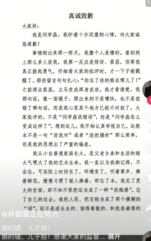 闫学晶母子先后道歉! 连个手写道歉信都懒得写,打印完了签个字儿就算完了事儿。 你吃肉我们没意见。可是你边吃肉还要边对我们这群汤都喝不上的人哭穷是我们不能容忍的。 而且,大家都知道,这不是对人民道歉,是跟人民币道歉罢了!
