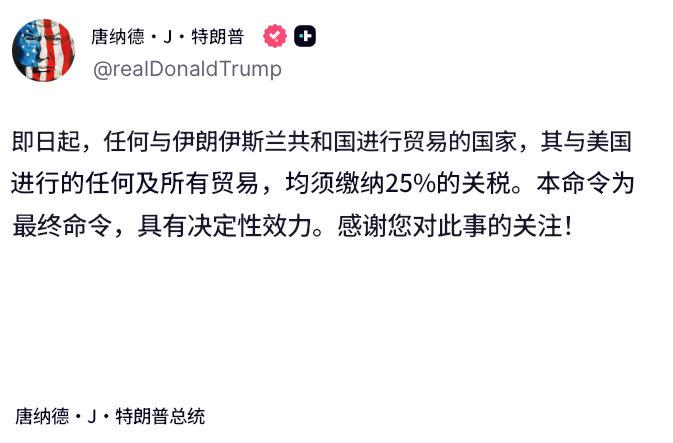特朗普这招是准备把伊朗往死里打,采取的钢墙铁壁的围堵战术,会让伊朗弹尽粮绝。 所有与伊朗有贸易的国家,与美国进行任何所有的贸易时,美国均加征25%的关税,这是特朗普最新下的指令,是最终命令。 25%的关税成本,对于任何一个依赖国际贸易的国家来说都不是小数目,毕竟做生意都是为了赚钱,没人愿意为了和伊朗的贸易,平白无故让自己和美国的贸易利润大幅缩水,甚至亏本,这种情况下,就算是之前和伊朗关系不错的贸易伙伴,也得坐下来重新掂量掂量孰轻孰重。 而伊朗这边,本身经济就因为之前的制裁已经千疮百孔,现在特朗普这波加码围堵,简直是往伤口上撒盐。 伊朗的经济结构本身就很单一,严重依赖石油出口,石油相关收入长期占外汇收入的绝大部分,而石油贸易又离不开国际市场,一旦和伊朗有石油贸易的国家因为关税压力纷纷退缩,伊朗的外汇收入就会出现断崖式下跌。 之前就有过类似的苗头,美国之前针对伊朗石油出口的制裁,就导致不少国家不敢轻易采购伊朗原油,连中国的一些地炼企业都没能幸免,山东的胜星化工和寿光鲁清石化就因为购买伊朗原油被美国制裁,导致企业美元结算中断,部分业务被迫停滞,甚至面临停工风险。 这些企业原本是伊朗原油出口的重要客户,现在连这样的合作都被美国强行打断,不难想象,在25%关税的威慑下,会有更多国家和企业选择放弃与伊朗的石油贸易,到时候伊朗连最核心的外汇来源都保不住,后续想要进口国内急需的商品都成了难题。 而外汇收入减少带来的连锁反应会迅速蔓延到伊朗经济的各个角落,首当其冲的就是货币贬值和通货膨胀。 事实上,在特朗普这次关税指令出台之前,伊朗的货币里亚尔就已经扛不住压力了,2025年一年的时间里,里亚尔对美元的汇率贬值了超过三分之一,到2025年底,自由市场上一美元已经能兑换一百多万里亚尔,而官方汇率和自由市场汇率的差距更是大得惊人,普通民众手里的钱一天比一天不值钱,原本能买一袋面粉的钱,过几天可能就只能买半袋。 这种情况下,伊朗的通胀率也居高不下,2025年12月的同比通胀率已经突破了五成,基本生活物资的价格像坐火箭一样上涨,普通伊朗人的全职月薪换算成美元也就一百多块,这点钱刚够勉强买些基本食品,想要维持稍微体面一点的生活都难。 特朗普的关税围堵一旦全面生效,伊朗的进口成本会进一步飙升,原本就紧张的物资供应会更加短缺,通胀只会越演越烈,民众的生活水平只会再往下探一个台阶。 另外经济上的困境必然会引发社会层面的矛盾,2025年底伊朗多地爆发的骚乱就是最好的证明,当时就是因为里亚尔暴跌,德黑兰的大巴扎店主们不堪重负,纷纷关店休市抗议,随后抗议活动蔓延到多个省份,甚至爆发了冲突,造成了人员伤亡。 这些骚乱的背后,是民众对经济状况的极度不满,是对政府无法稳定物价、保障民生的失望。 特朗普的关税围堵也会让这种不满情绪进一步发酵,当民众连基本的生活都难以维持,当手里的积蓄不断缩水,当国内物资短缺的情况越来越严重,原本隐藏的社会矛盾都会被激化出来。 最关键的是,伊朗政府为了应对经济危机,已经出台了不少措施,比如更换央行行长、加强货币管控、给民众发放生活补贴等,但这些措施在外部严厉的经济封锁面前,效果都十分有限。 现在特朗普又抛出关税大棒,相当于切断了伊朗通过国际贸易缓解经济压力的最后一条路,国内经济无法好转,民众的不满就会持续积累,社会动荡的风险也会不断升高。 可能有人觉得,会不会有国家不顾关税压力继续和伊朗贸易? 但现实情况是,美国的“长臂管辖”早就织成了一张大网,谁敢不听话就制裁谁,之前墨西哥的企业家和公司因为帮助委内瑞拉逃避制裁,就被美国冻结了资产,禁止参与任何美国相关的交易,这种杀鸡儆猴的手段,没有哪个国家敢轻易无视。 而且现在全球经济本身就不算景气,各个国家都在精打细算维持贸易利润,25%的关税成本足以让大多数国家望而却步,毕竟和美国的贸易体量往往远大于和伊朗的贸易,为了小部分利益放弃大部分利益,显然不符合任何一个国家的经济理性。 特朗普就是吃透了这一点,才敢抛出这个“最终命令”,他要的不是协商,而是彻底切断伊朗与国际市场的联系,让伊朗陷入孤立无援的境地,慢慢消耗伊朗的经济实力,最终达到让伊朗弹尽粮绝的目的。 这种用全球贸易规则当武器的做法,看似是商业手段,实则是霸权主义的赤裸裸体现,把经济问题政治化,把贸易当成打压他国的工具,最终受苦的还是普通民众。 美国这种通过胁迫他国选边站队来围堵对手的套路,虽然短期内能给伊朗造成巨大压力,但本质上是在破坏全球贸易秩序,是在把经济全球化往碎片化的方向推,不过对于当下的伊朗来说,这些长远的影响已经无暇顾及,如何应对眼前的经济窒息才是最紧迫的问题。