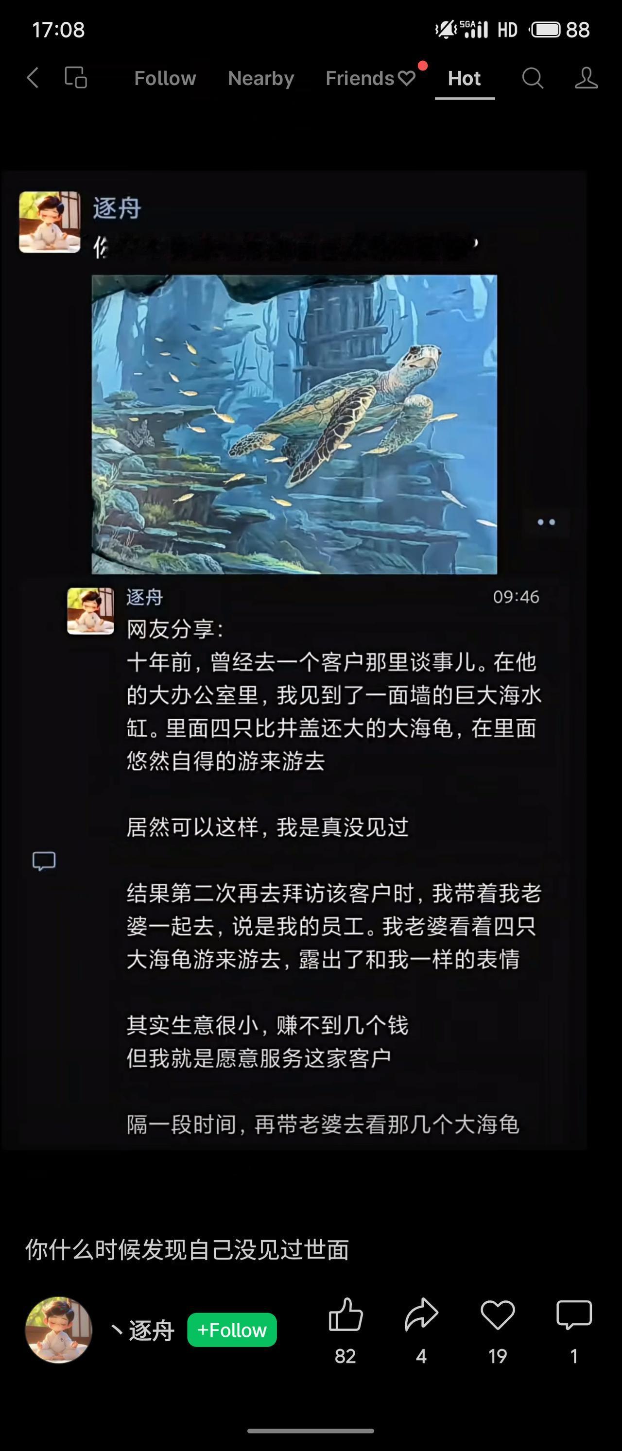 网友分享十年前的经历:去客户办公室时,被一面墙的巨大海水缸震撼,缸中有四只巨大的海龟悠然游动。这令他深感“没见过世面”。此后,他多次带妻子前去观看,并因这个独特的场景而乐意维持这段业务关系。