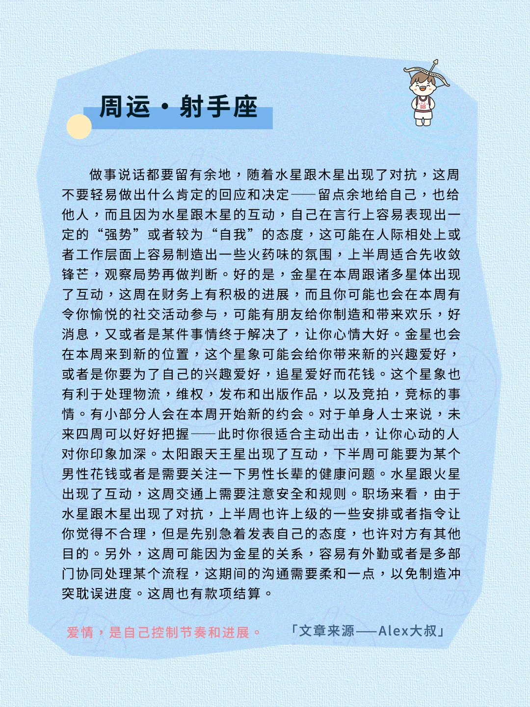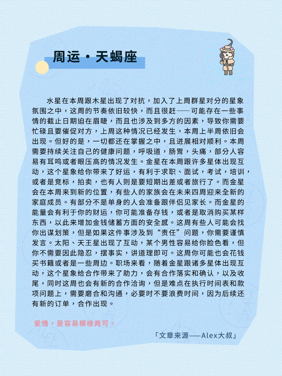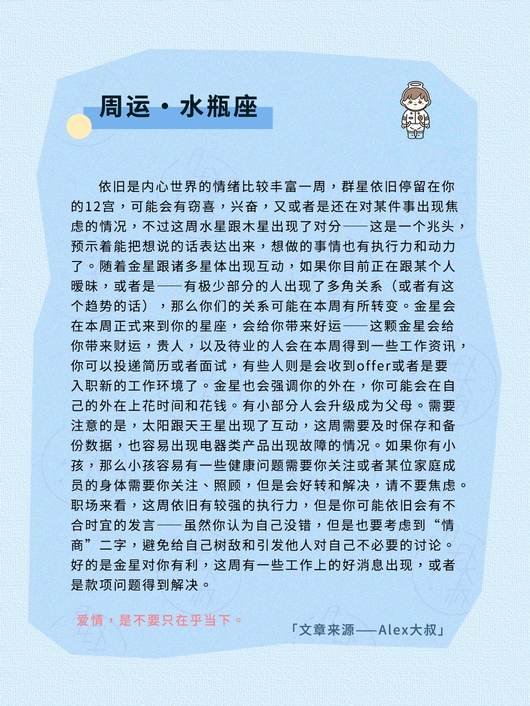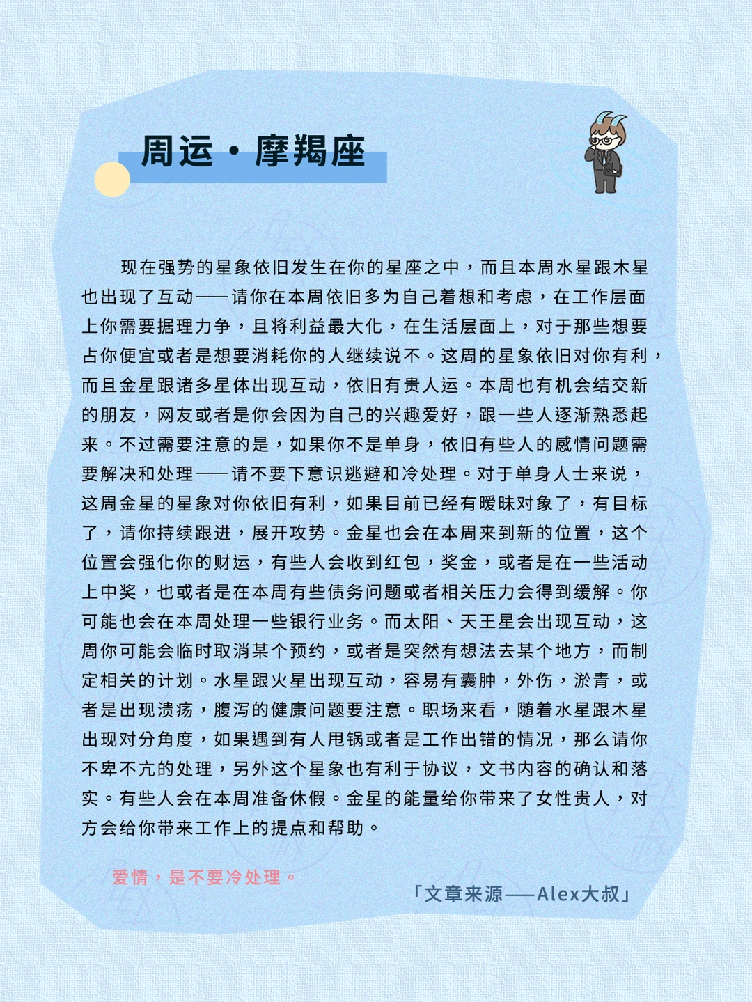 综合本周的星象,这是一个想法多,执行快,但却也容易“一个想法决定全局”“一眼定生死”的星象氛围,我们需要抽丝剥茧看到自己和他人的深刻动机,不要因为一个念头而决定全盘或者否定全盘,根据出现的变化,随时调整自己的心态和节奏、思维模式,就会出现意想不到的惊喜和成功。