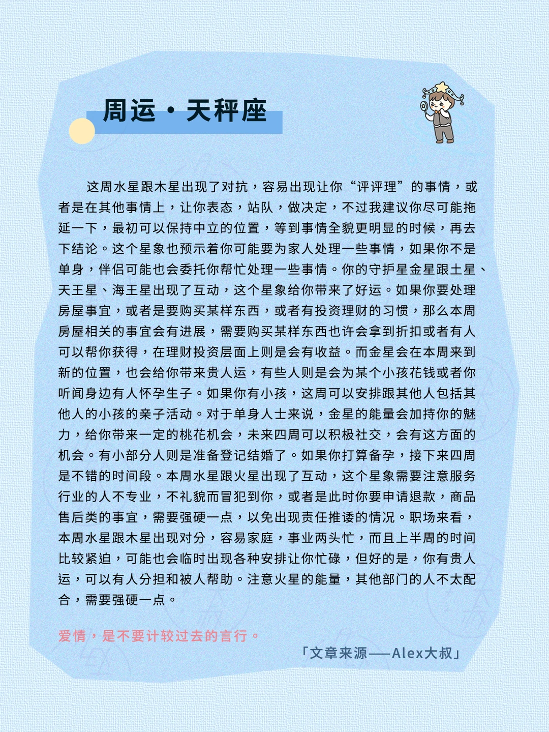 金星会在本周进入新的位置,而这个位置是风象星座,金星倡导的是快乐,也代表着物质,价值观和审美,当金星进入这个位置,意味着我们希望跟他人相处的时候,更加平等,能够互惠互利,不要出现过分越界的情况。而此时许多人在未来四周的时间里,可能想要尝试一些新的风格,也许是妆容,穿搭,也许是日常喜好的东西,比如饮食或者跟审美相关的,也会有一种新的想法——想要尝尝鲜,想要试试看。而也有人则是会出现新的桃花,不过你们之间似乎有点若即若离的拉扯或者是沟通,相处频率不一定特别高,但却又有一种精神共鸣在,对此可以慢慢来,不要求快。
