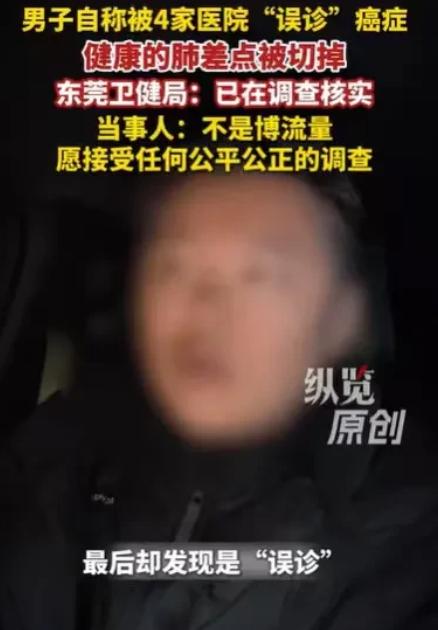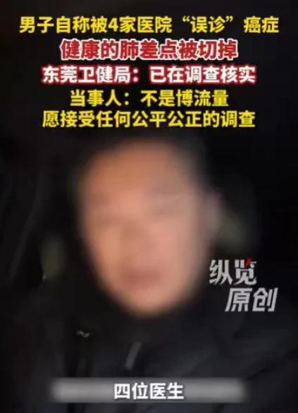 广东东莞,男子咳嗽非常严重,他去检查,结果医生告诉他,他的肺部有恶性肺结节,要马上手术,男子辗转4家医院,4个医生诊断,男子都被诊断为癌症,男子认命,决定手术,可手术之前,助理医生却告诉他,他的肺干干净净的,不需要住院手术。   “医生你确定吗?我前前后后折腾了两个月,一共去了四家医院,都说我必须手术啊!”2024年3月,李某(化姓)拿着那最新出炉的肺部CT报告,声音因激动而有些变调。   毕竟这两个月来,他先后经历了恐惧、奔波与认命般的绝望,没想到竟然在最后关头,厄运竟戛然而止。   这是李某自2024年1月,被“确诊”恶性肺结节后,复查的第5家医院。原本他已经做好了要动手术的心理准备,可没想到这次复查,竟然推翻了之前4家医院的相同结论。   医生指着CT报告,明确告知:“两肺纹理清晰,没什么病变,无需手术。”一瞬间,“死而复生”的情绪化作更汹涌的困惑与愤怒。   如果说自己压根没毛病,那前4家医院的诊断又是怎么回事?自己两个月来遭受的煎熬、恐惧又算什么?   李某怀着无比复杂的心情,把自己的遭遇发到网上。消息传开后,立刻引来无数关注。大家都对此事感到后怕和愤怒:“4家医院都错?这太离谱了,以后老百姓还能相信医院的诊断吗?这简直是拿任命开玩笑啊!”   这件事最刺痛人的地方,或许不是技术上的误判,而是在整个过程中,那份属于患者的“知情权”与“选择权”似乎被模糊了。   面对一个突然出现、性质不明的结节,临床路径除了“手术”,其实还有“先进行抗炎治疗,短期复查对比”这一更保守的选项。   但在实际中,面对焦虑万分的患者和家属,以及规避延误治疗风险的压力,医患双方都很难有足够的勇气,去选择那条充满不确定的“观察之路”。   沟通的简化,最终只给了李某一道“单选题”,但这不应该成为诊疗不严谨的理由。这事能引发这么大关注,核心是戳中了普通人的就医焦虑。   对老百姓来说,医院和医生就是最后的依靠,可一旦遇到误诊,这份信任就会瞬间崩塌。这事也给大家提了个醒,遇到重大疾病要手术的情况,别盲目相信单一诊断,多找几家医院看看,是对自己的生命负责。   目前,东莞市卫生健康局已关注到网络视频,并表示将对情况进行调查核实。也希望相关部门能尽快给出调查结果,给当事人一个交代,也让大家看到规范诊疗的决心。   对此你有什么看法?欢迎在评论区留言讨论。正能量 致敬   信息来源: 纵览新闻|东莞市卫健局回应“男子称被4家医院误诊癌症”:将进行调查核实;当事男子回应“不是博流量,愿接受任何公平公正的调查” 文|墨海 编辑|史叔