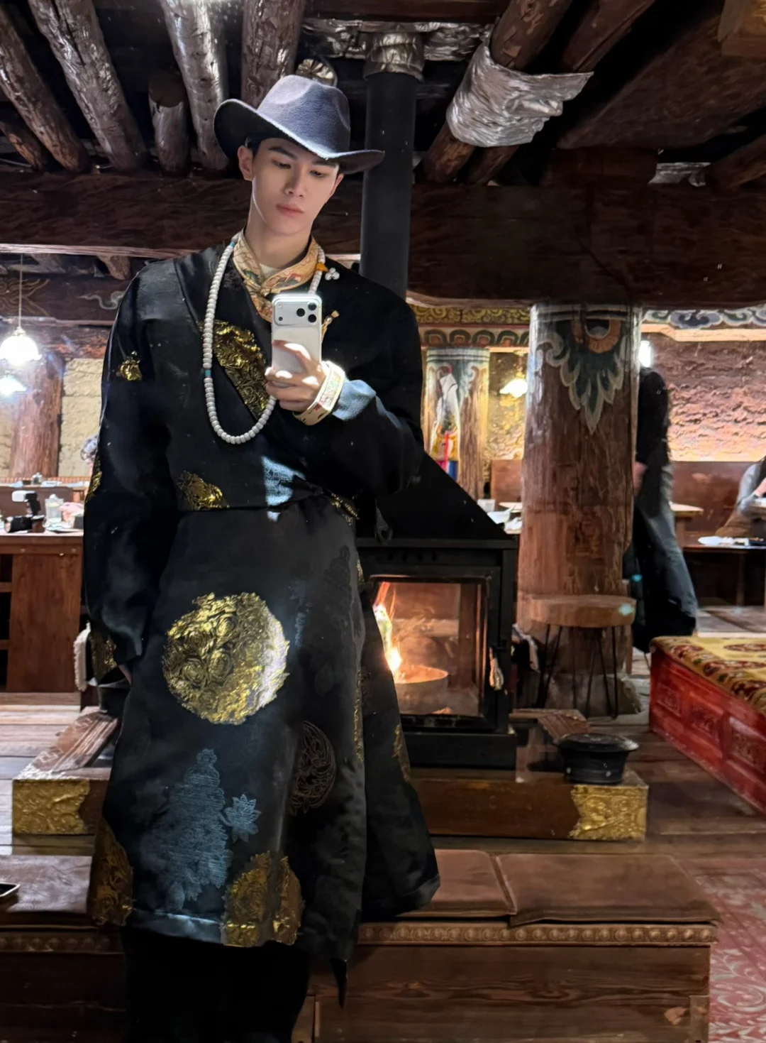 风拂柳,粉樱绽放,我身着浅粉蕾丝旗袍,立于古栏之下。长袖轻笼,盘髻缀珠,耳坠摇曳