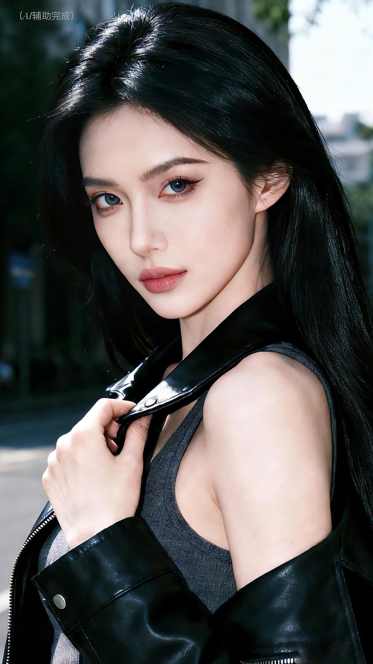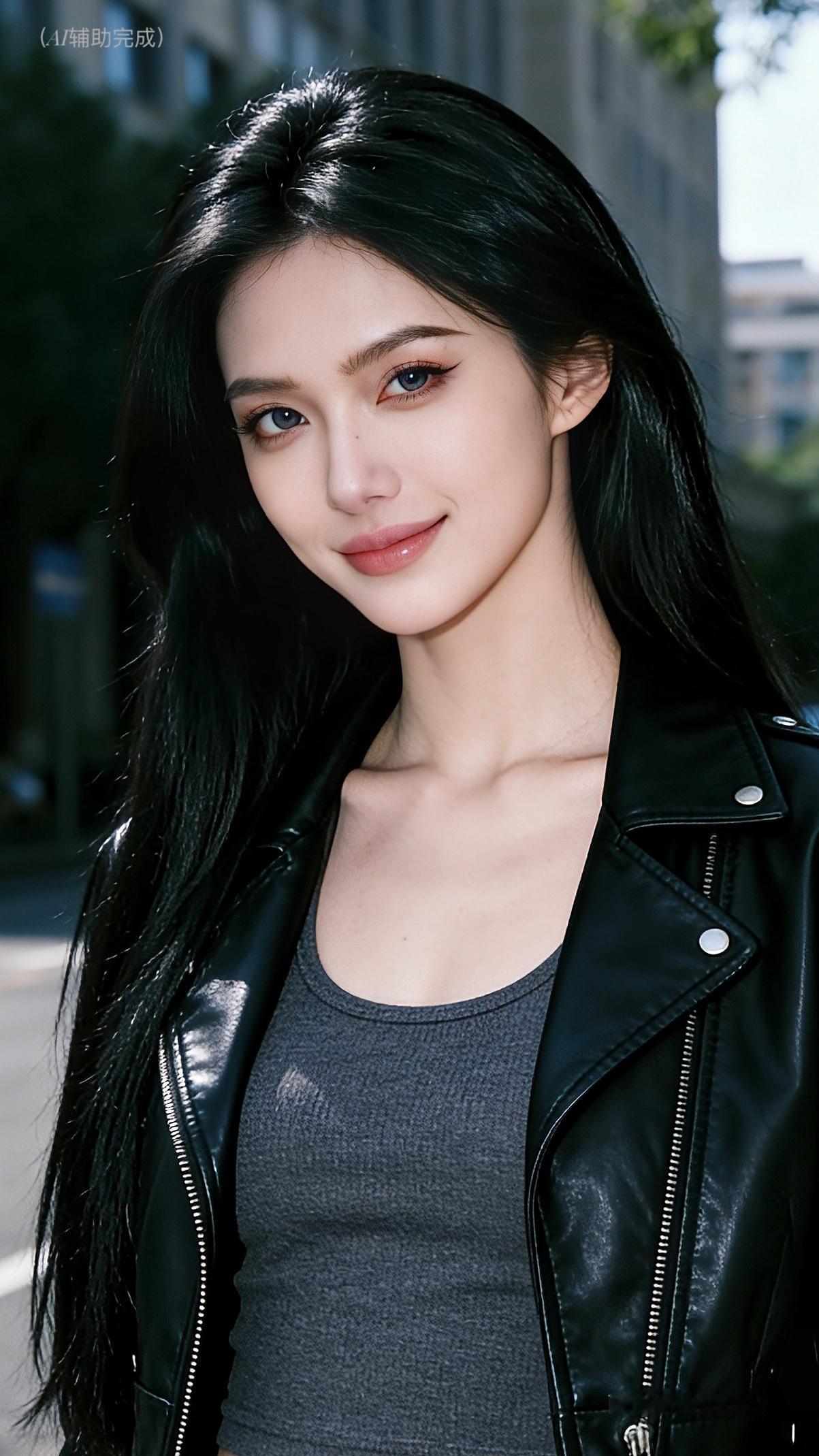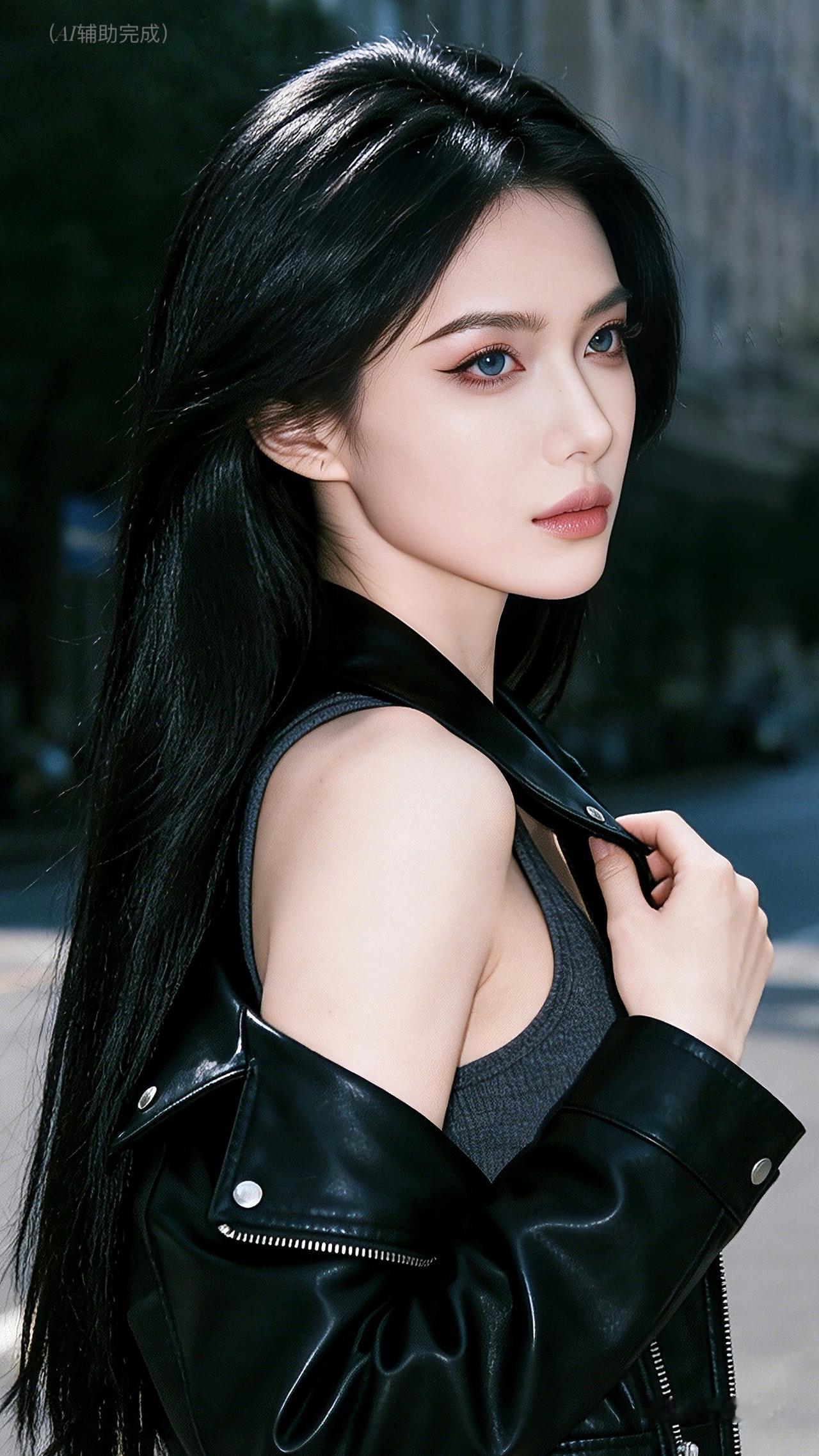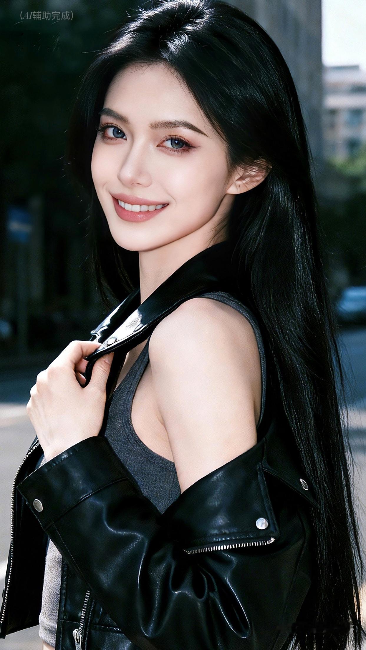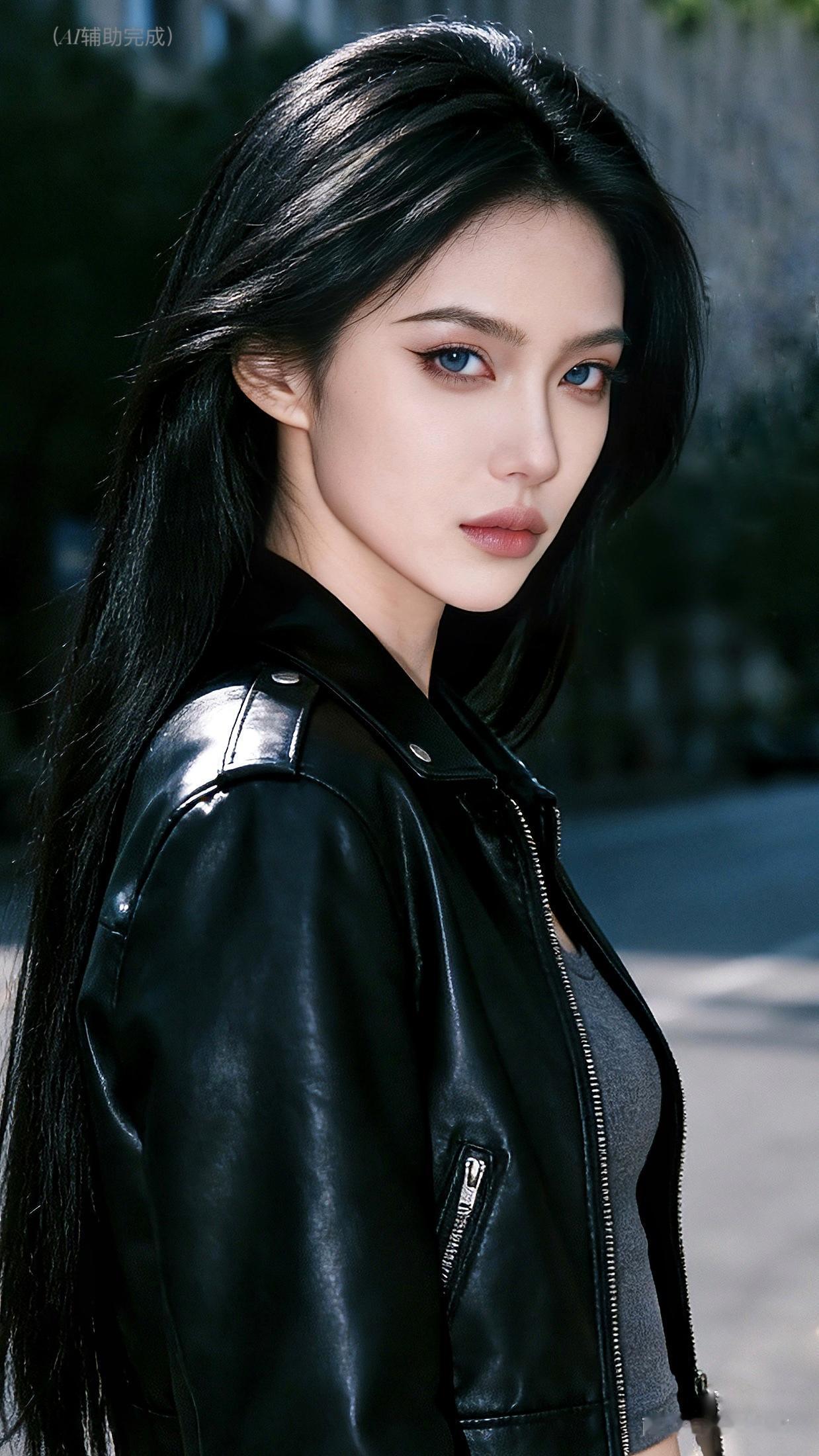 乌黑长发如瀑垂肩,蓝眸藏星眼含笑。黑皮夹克轻拉领口,灰背心露光洁颈线,酷帅与柔美相融。都市街景虚化作幕,光影漫过精致侧颜,随性洒脱间尽展独特魅力,这帧飒爽美,一眼心动。