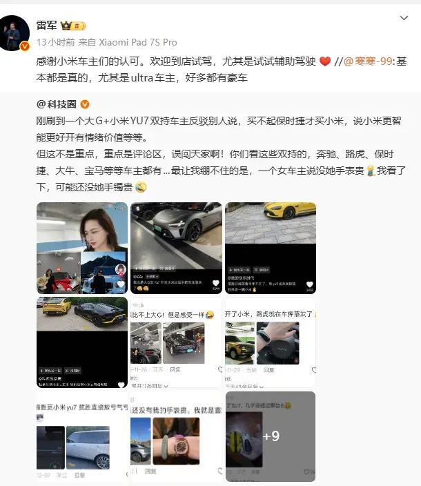 “不是保时捷买不起,小米汽车就是喜欢”!高端米粉出手,雷军狠狠了扳回一局。最近小米汽车再度密集出圈,尤其是发生“小米KOL风波”后,又炸出了不少小米黑粉,不光无端黑小米,就连小米汽车车主也黑。 只不过这次米黑们算是踢到铁板了,别说小米和雷军看不下去自己客户被黑,就是小米车主自己也忍不下这口恶气,于是果断出手,给与了米黑一记响亮的耳光。就连雷军看到了,也直接高呼感谢车主认可。 起因是有米黑怼着一个小米女车主,讽刺她是买不起保时捷,才买的小米。没想到女车主直接晒出了起价230万的奔驰G63,直接让米黑哑口无言。而在这个车主的评论区,很快引来了大批小米高净值车主,他们纷纷晒出自己的豪车和小米同框,有兰博基尼、路虎揽胜、奔驰E级等等,这些同为小米车主的米粉们直言,不是买不起,就是单纯的喜欢小米。 难怪雷军看到都感动的点赞,还欢迎其他人到店试驾小米。其实用不着小米车主自证清白,雷军此前就已经公开过更具说服力的数据。2024年刚开始交付SU7不久,雷军透露小米车主的iPhone用户高达46%。这个数字背后的意义,清晰代表了大批高净值人群对小米汽车的认可。而到了2025年,雷军更新了这个数字,其中SU7车主iPhone用户有48%,而YU7车主的iPhone用户占比52.4%,而且超过50%车主来自于保时捷、奔驰、特斯拉等豪车用户。此外小米汽车卖的最好的前十大地区,都在杭州、上海、成都、深圳等一二线城市,这些地方也都是豪车的主要产销地。 所以这一局,米黑们彻底败了,他们选择用“没钱买小米”来黑小米,一开始就证明了他们的短视和无知。别说卖到30万的小米汽车,丝毫跟便宜和廉价不搭噶,干到8999的小米手机都被抢购,性价比这个标签早都不适合贴在小米身上了。说到底,这既是小米的成功,更是雷军的功劳。