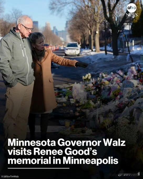 民主党州长悼念被ice打死的蕾妮·古德 明尼苏达州州长蒂姆·沃尔兹和他的妻子格温昨天前往蕾妮·古德的纪念中心,现场里摆满了鲜花和标语,民主党的支持者正在酝酿更大的抗议活动,他们认为ice 正在向党卫军转变,随意草菅人命,杀害美国公民。
