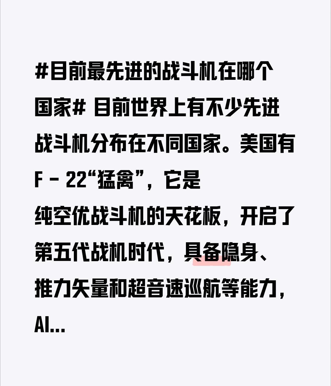 目前世界上有不少先进战斗机分布在不同国家。美国有F - 22“猛禽”,它是纯空优战斗机的天花板,开启了第五代战机时代,具备隐身、推力矢量和超音速巡航等能力,AIM - 120D导弹搭配APG - 77雷达,空战胜率极高,但停产多年、航电旧且无对地核打击能力。还有F - 35“闪电II”,是三军通用隐身多面手,全球销量最大的五代机。 中国的歼 - 20“威龙”也不容小觑,有远程截击和隐身空战能力,后发航电与WS - 15发动机加持。俄罗斯的苏 - 57“felon”超机动和远程打击能力强。很难说哪个国家有绝对最先进的战斗机,各国先进战机都有自身独特优势。 不过,战斗机的先进性评判是多维度的,除了以上提到的性能,维护成本、升级潜力等也是重要因素。美国的两款战机虽技术成熟,但F - 22停产后续升级受限,F - 35则面临成本超支和维护复杂的问题。中国歼 - 20依托国内强大的科研实力,在航电系统等方面不断迭代进步,且随着WS - 15发动机的成熟,其飞行性能将进一步提升,在未来空战体系中潜力巨大。俄罗斯的苏 - 57凭借其出色的超机动性能,能在近距离空战中占据优势,并且其远程打击能力也能对敌方纵深目标造成威胁。 未来,随着六代机概念的提出,各国都在积极布局。在这场航空技术的竞赛中,或许会有新的国家脱颖而出,也可能现有强国继续保持领先。究竟谁能在未来战斗机领域独占鳌头,让我们拭目以待。
