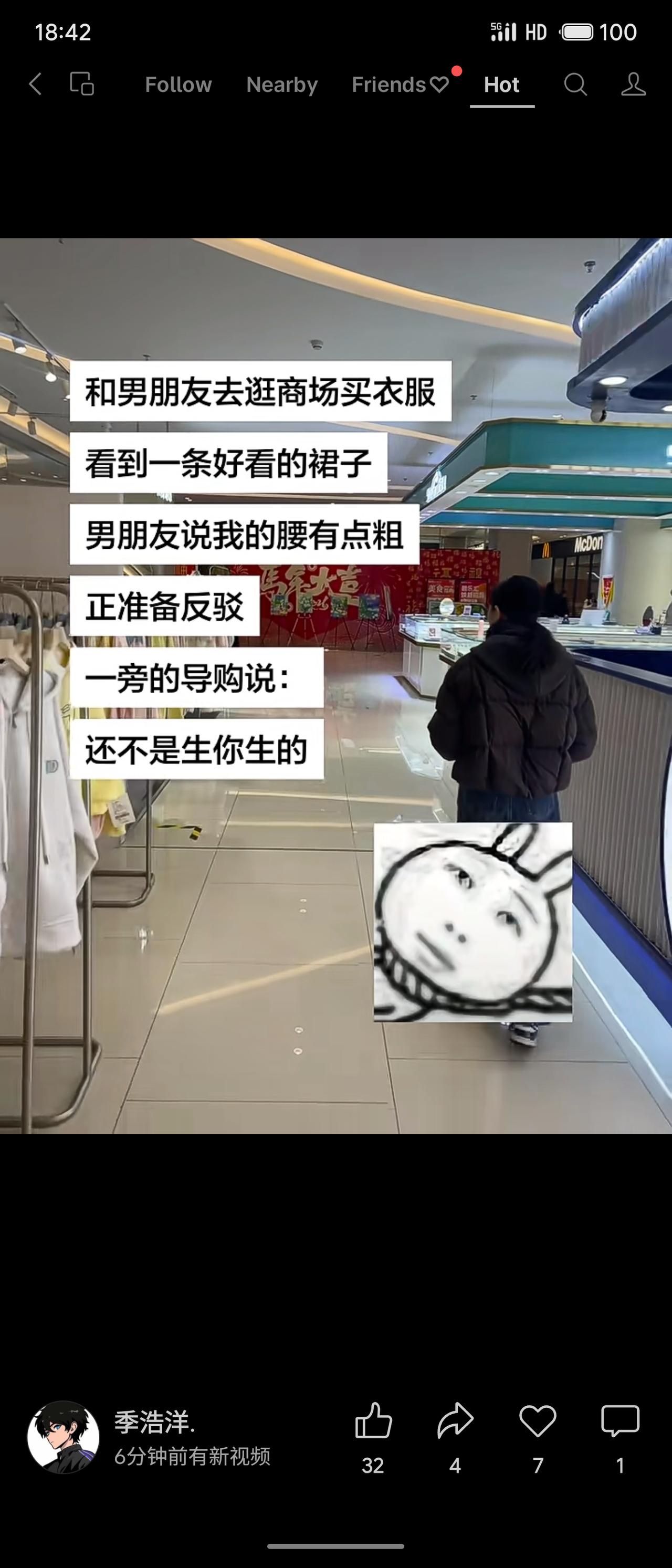 和男友逛街试裙子,他随口说我腰粗。我刚想反驳,一旁的导购大姐机智接话:“还不是生你生的!”轻松化解了小小的尴尬。