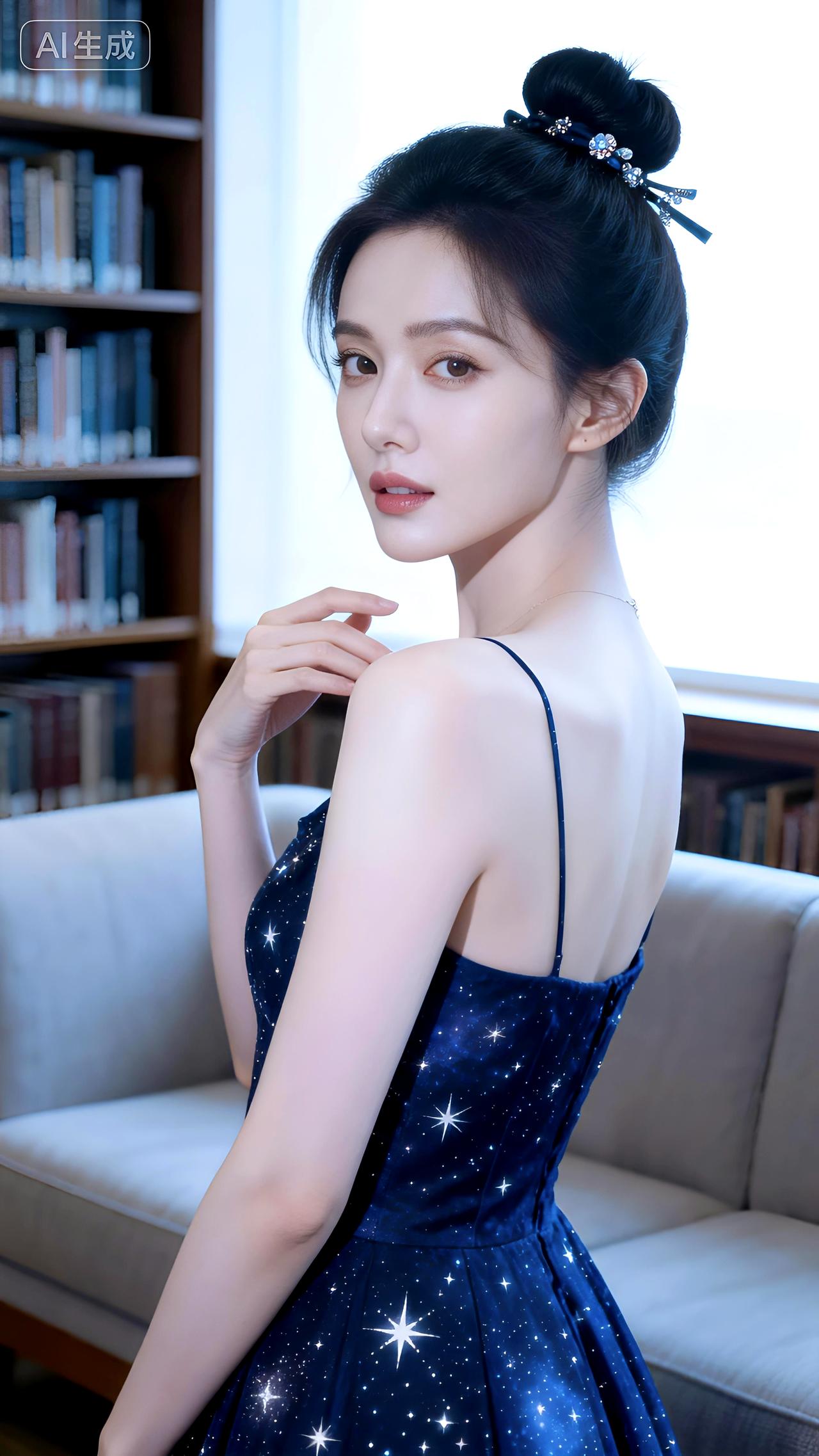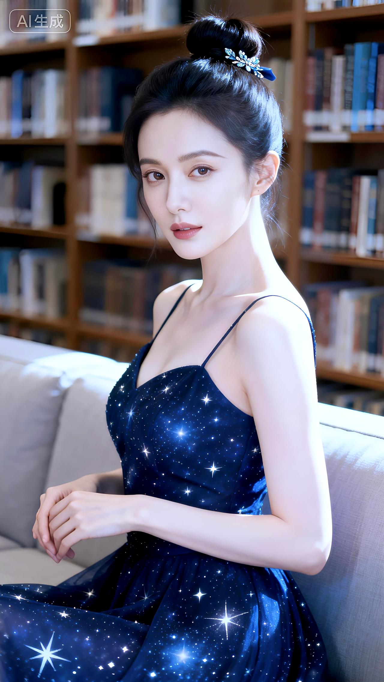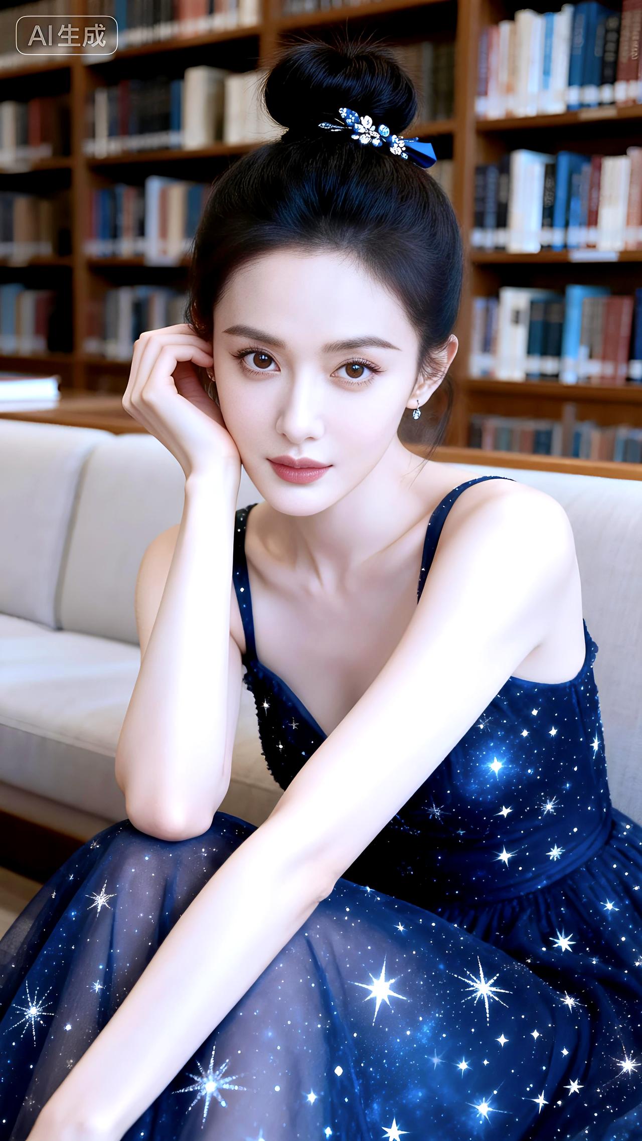 图书馆静影婆娑,蓝裙御姐醉风华。