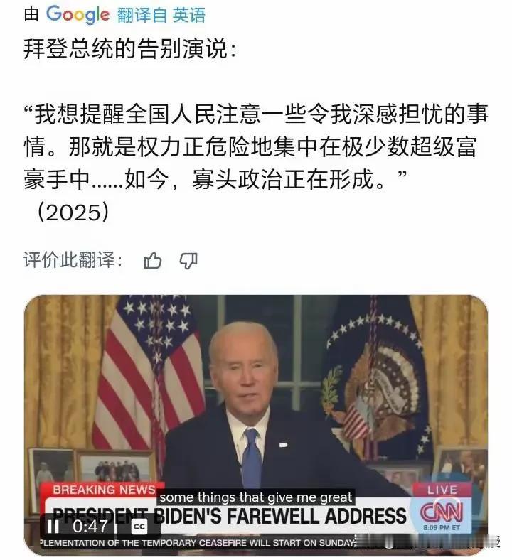 拜登早就预言了今天的局面,拜登告别演说的一句话含金量正在上升。 看下图,拜登2025年告别演说里直言“权力正危险集中在少数超级富豪手中,寡头政治正在形成”,当时听来像句政治表态,如今特朗普的一系列操作,让这话的含金量直接拉满。 特朗普绕开国会就扬言对委发动军事行动抢石油,还自封委代总统,甚至放话要针对墨西哥、哥伦比亚、古巴,觊觎格陵兰和加拿大。 特朗普2025年开启第二任期后,并未践行“和平总统”的承诺,反而在不到一年时间里对7个国家发起军事行动,特朗普实施了至少626次空袭,这一数字直接超过拜登四年任期的555次军事打击总量,其所谓“以实力求和平”的战略,实质是武力扩张的借口。 特朗普宣称他不需要国际法,“自身道德是唯一限制”。权力的任性与扩张,被他演绎得淋漓尽致,众多有资源的小国都战战兢兢。 当总统的个人意志凌驾于制度之上,拜登口中的寡头政治,早已不是预警,而已经成为现实。