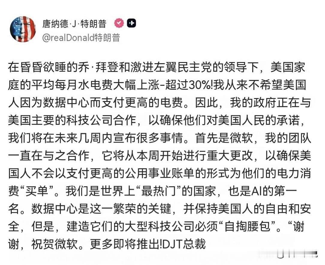 科技公司逃离美国即将开始,特朗普要求科技公司的数据中心“自掏腰包” 电力设施是限制AI发展的最大桎梏,因为AI背后的算力中心能耗非常巨大,以Chat GPT为例,一次模型训练的用电相当于美国1.7万户的居民日常用电。而美国的电力设施根本不足以支撑这种电量消耗。 美国现在大模型的市场收益微乎其微,现在特朗普要求科技公司“自掏腰包”,可能就会让各大科技公司的财政雪上加霜,所以这只能会让各大科技公司加入逃离美国。