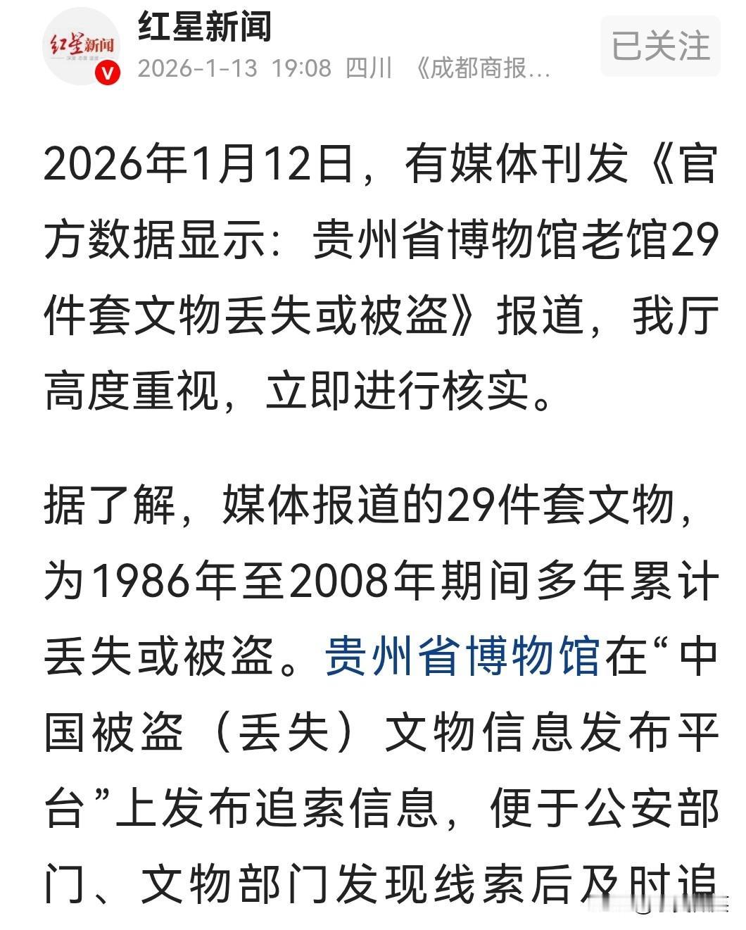 贵州省博物馆怎么了? 20年的时间里,累计丢失(被盗)29件珍贵文物。 究竟是真被盗还是监守自盗? 贵州省文旅厅表示,将成立联合调查组,全面调查核实,依法依规严肃处理。