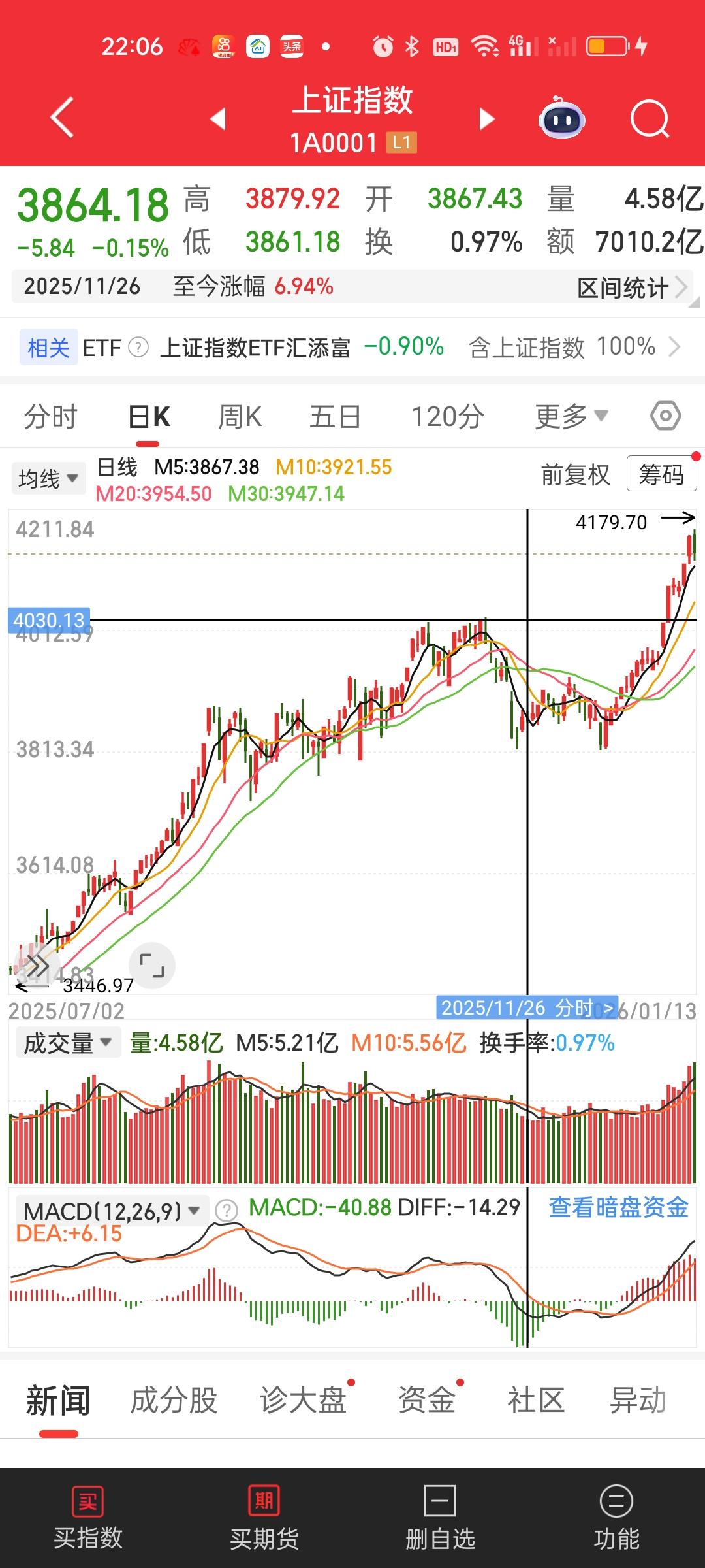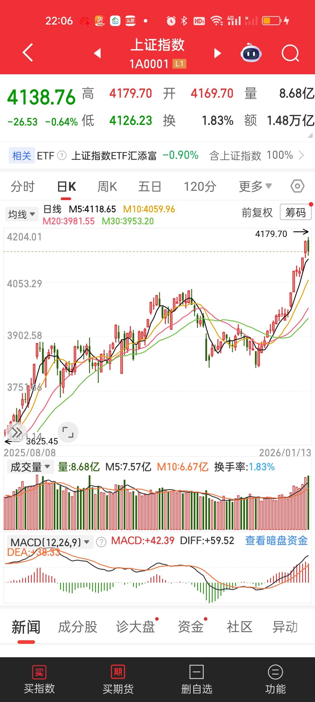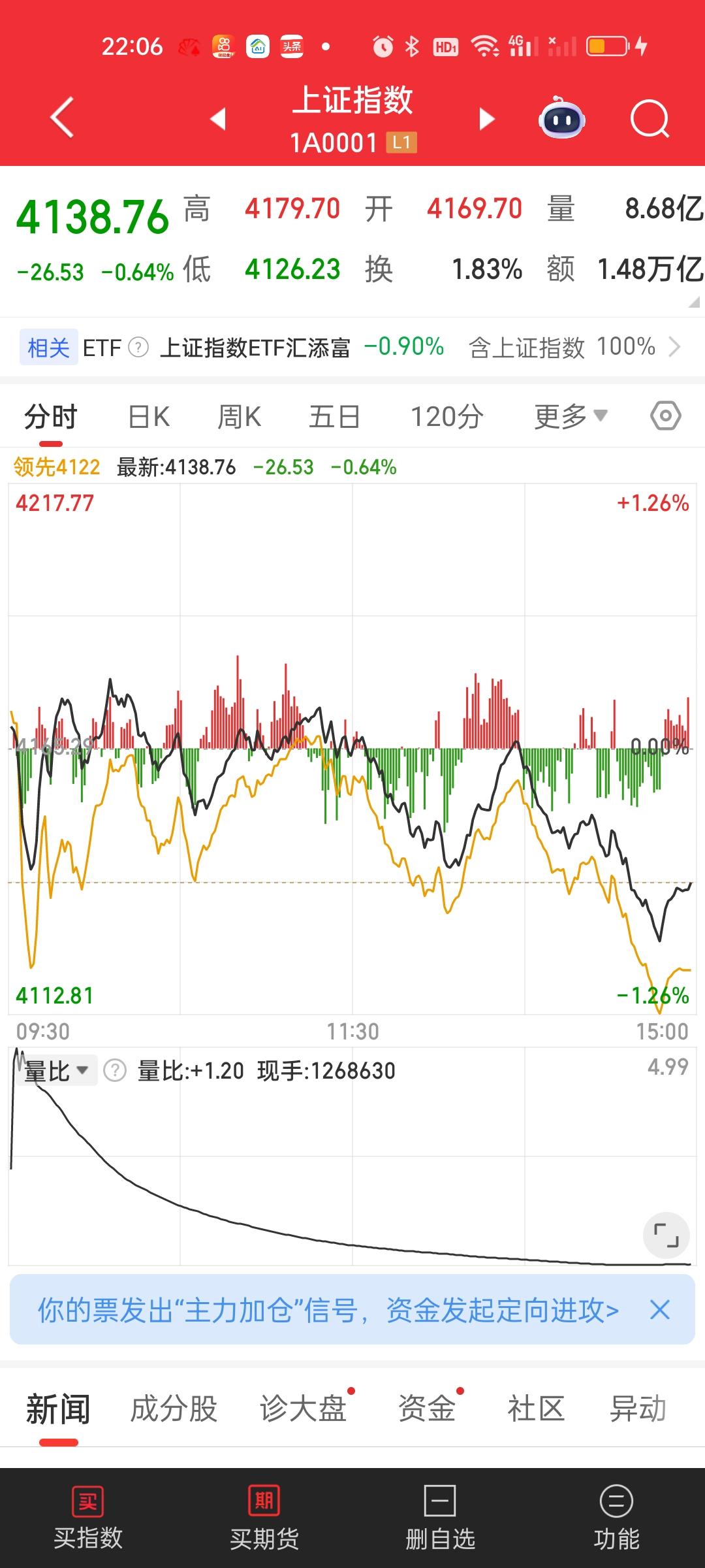 首先这个地方不好明确看下跌开始,因为K线依旧是妥妥的多头排列。如果明天成交量比今天还大上1000亿,明天依旧有机会反包。但就算反包,高度也不会太高了,这轮大概率走到4198还会向下。 这么大的成交量是没有办法做到单根K线做顶的,大概率会走平台震荡做顶。阴线阳线交替。今天最高点4179.70,最低点4126.23,收在4138.76, 上一个平台顶部是4030,4030/4138=0.9739,空间也只有2.61%。硬抗也可以,减掉一点仓位也可以。 如果明天走反包,那很明确,今天指数是什么板块带下去的,明天这些板块自己出来修复就好了。这意思已经很明确了,对吧。大家应该都能听懂。
