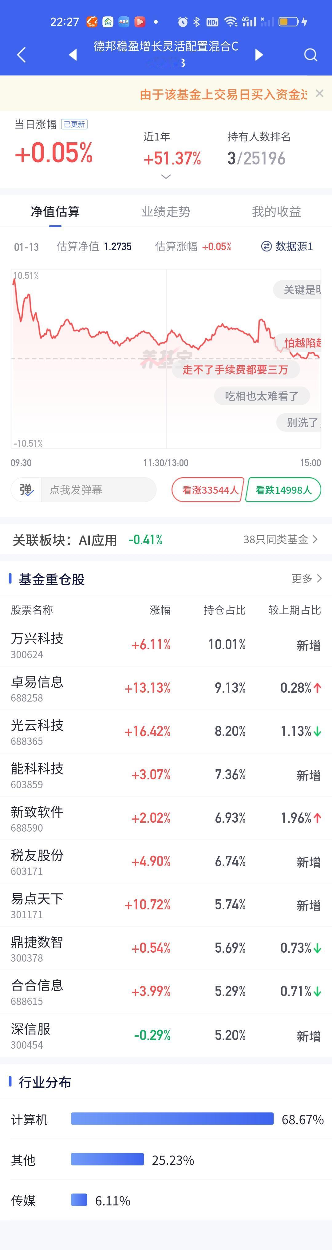 AI应用板块今天依旧比较强势,在指数放量大跌的前提下涨的其实还可以。德邦稳盈看持仓最少涨5个点完全没有问题,但实际开出来只涨了0.05%,这个到底是怎么回事啊?仅仅是因为进来的资金太多摊薄了收益吗?这里面有没有可能就是基金经理调仓换股了?如果说昨天低开6个点是这个原因该说的过去,难道今天又是这个原因?